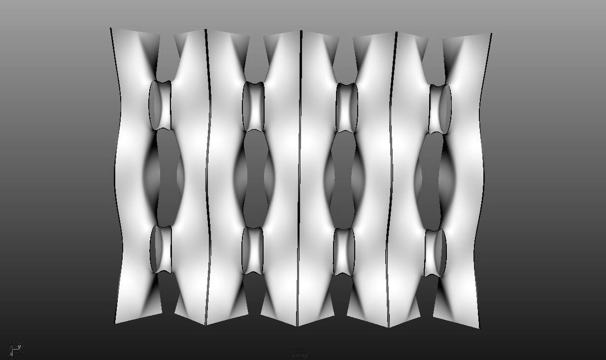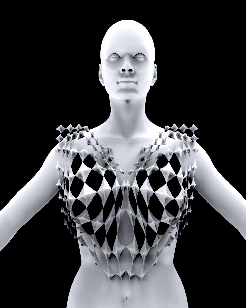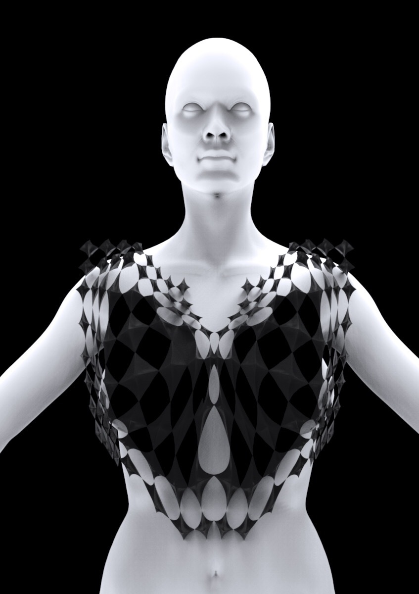 这个3D面料目录是一个自主发起的研究项目,旨在探索如何利用3D打印和激光切割等数字制造技术,用创新性的方式创造时尚织物。面料3D图案是使用3D建模软件创建的,带有可重复的3D组件,这些组件沿着服装轮廓的曲线和曲面在人体上扩散。