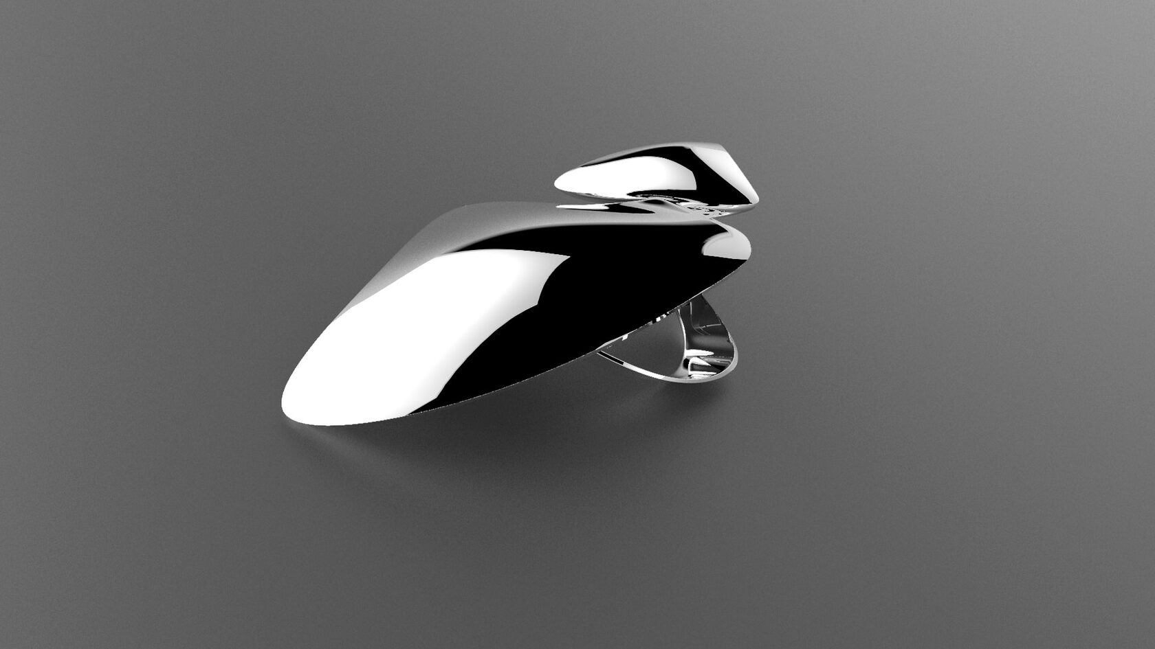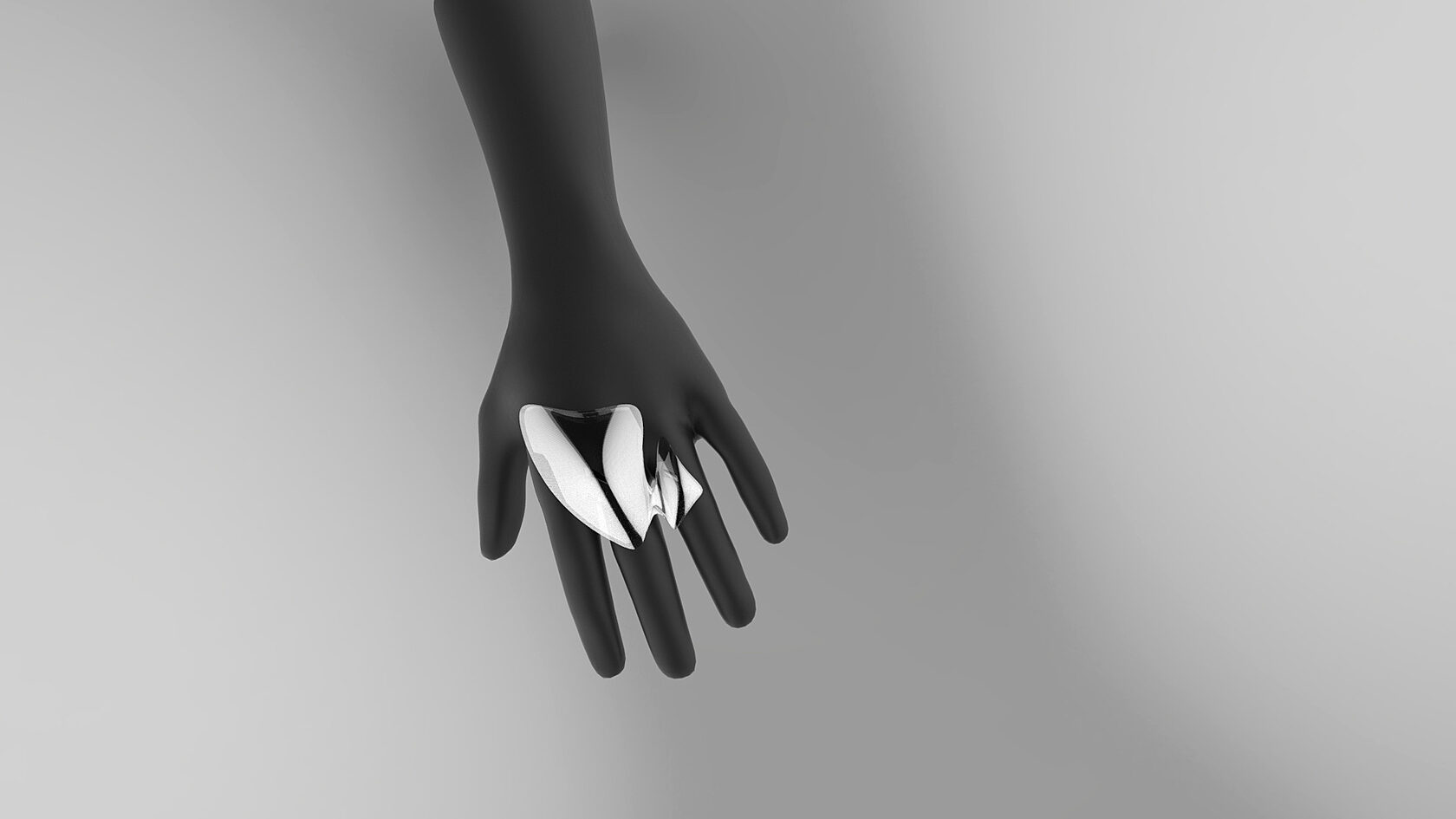 Armour ring is a self-initiated jewellery project that has an idea of armour protecting fragility of a human body. The ring is quite big in size to cover a big part of hand. The armour ring is inspired by ancient warriors’ armour. Its smooth and strong shell emphasises our fragility and shows the contrast between the protecting armour and the delicateness of skin by covering part of fingers and hand.