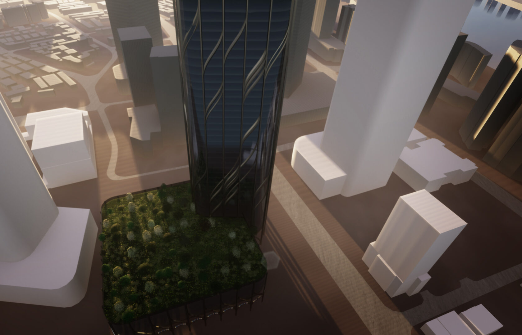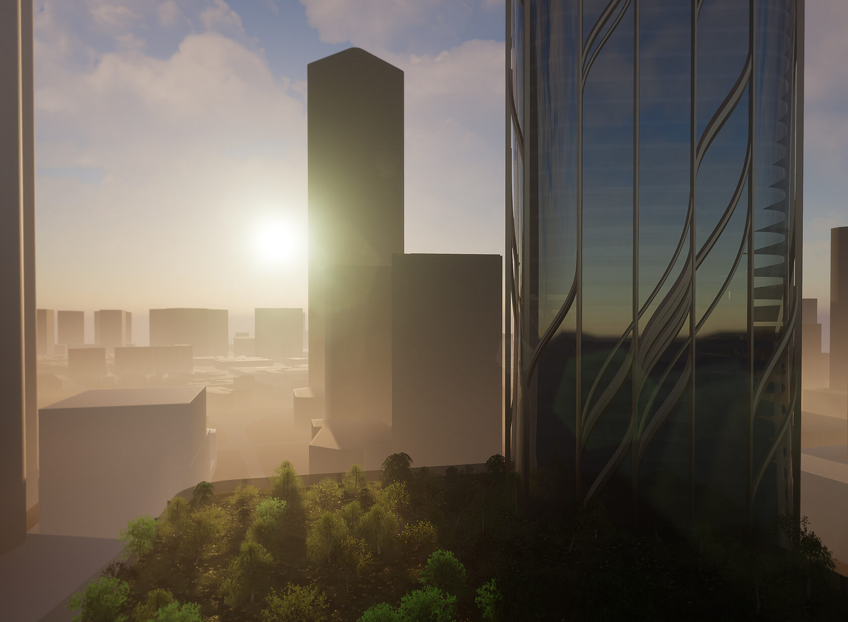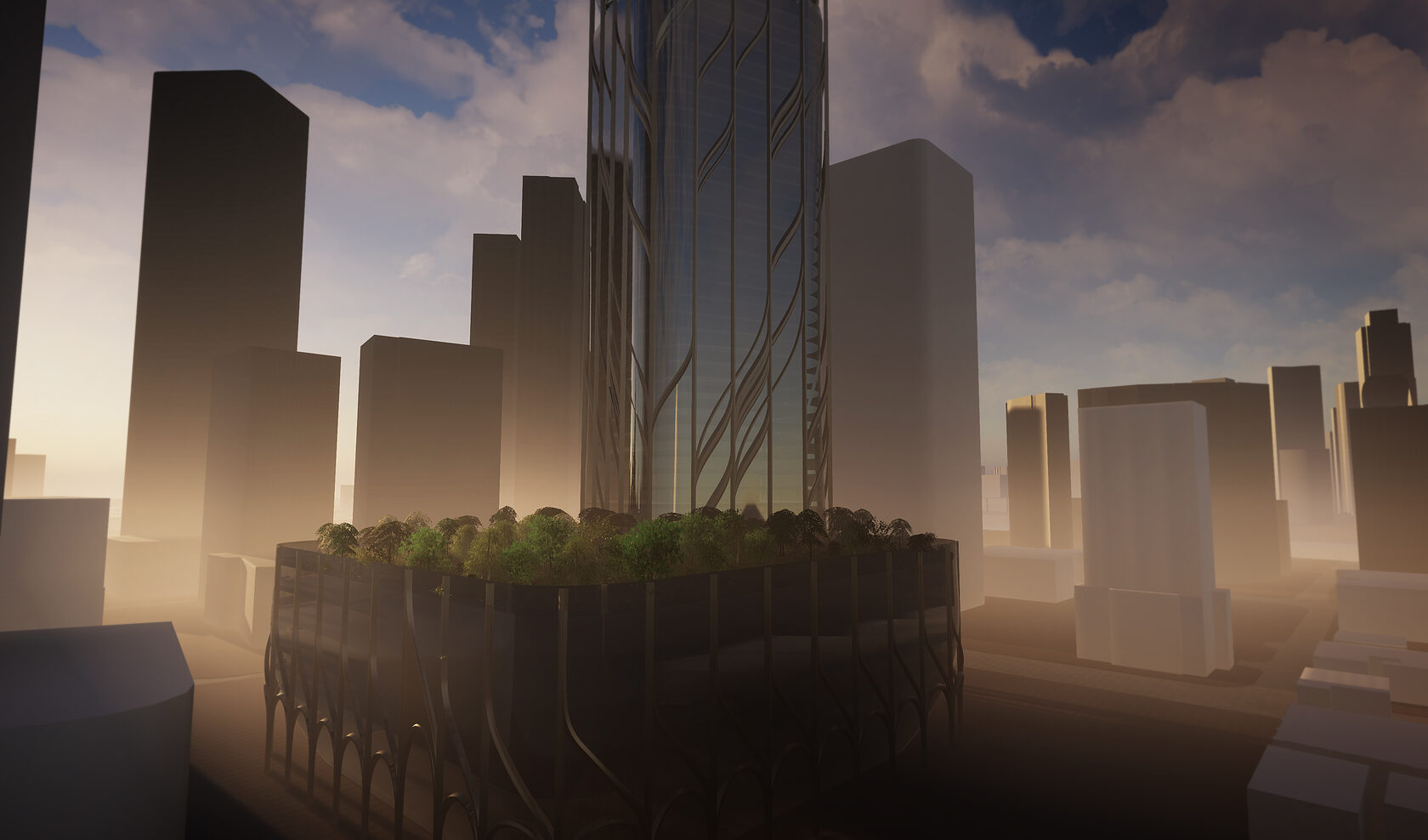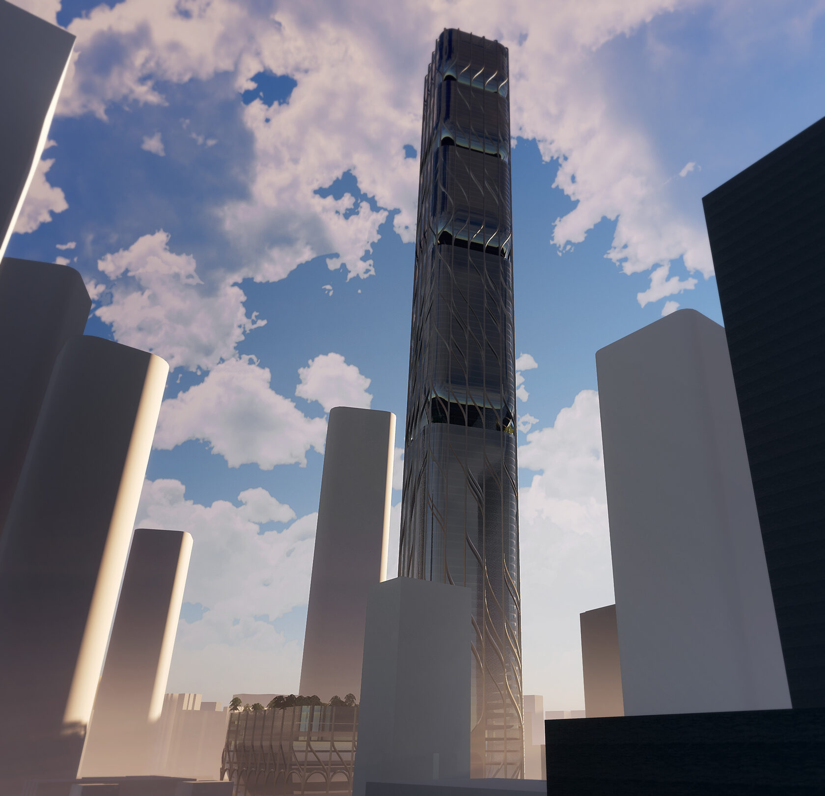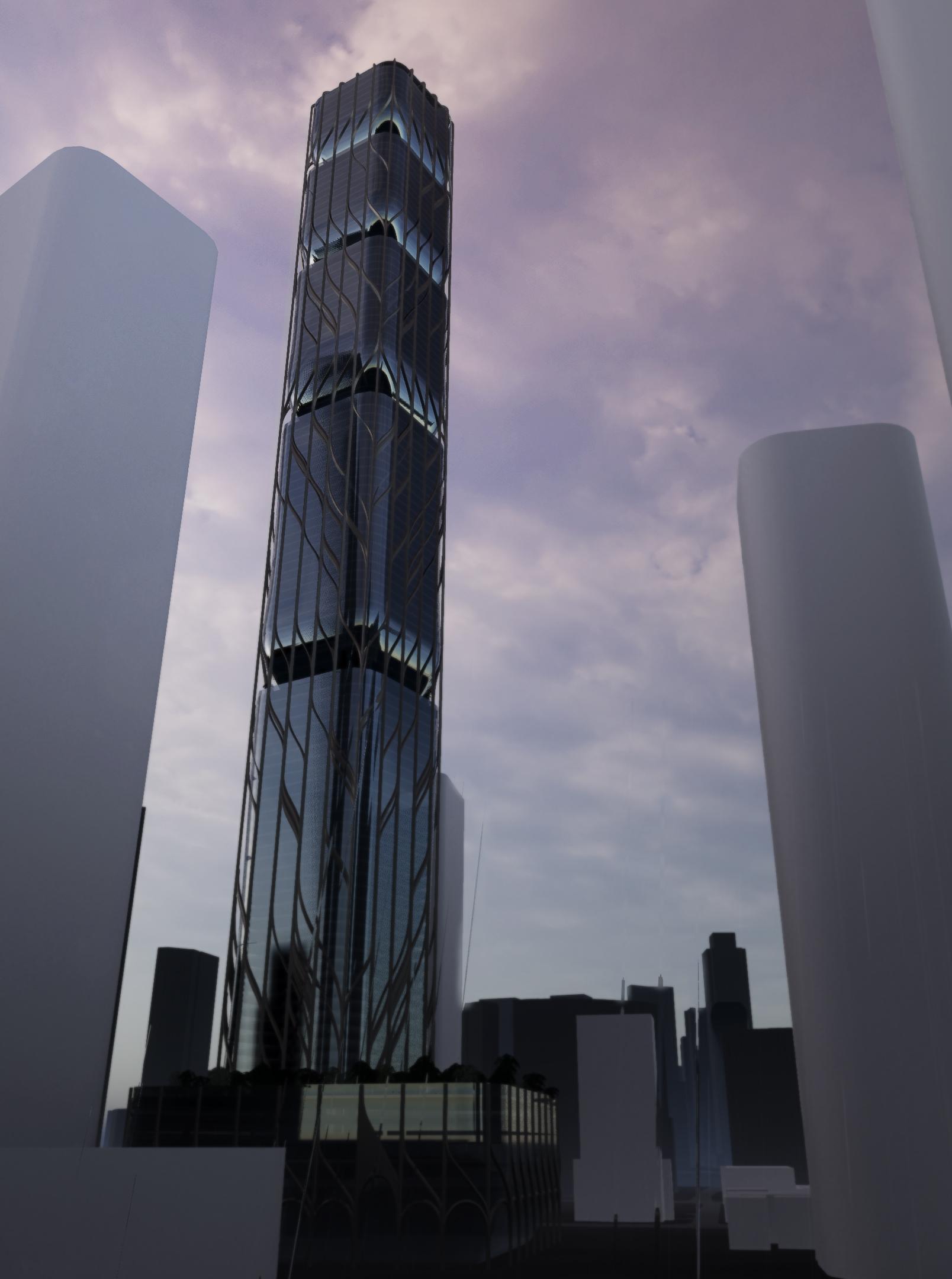 The whole project was driven by a single parametric script. The parametric script drives massing of the tower and podium, slabs generation, control over facade 'cage', calculation of areas, and calculation of efficiency of the tower.
