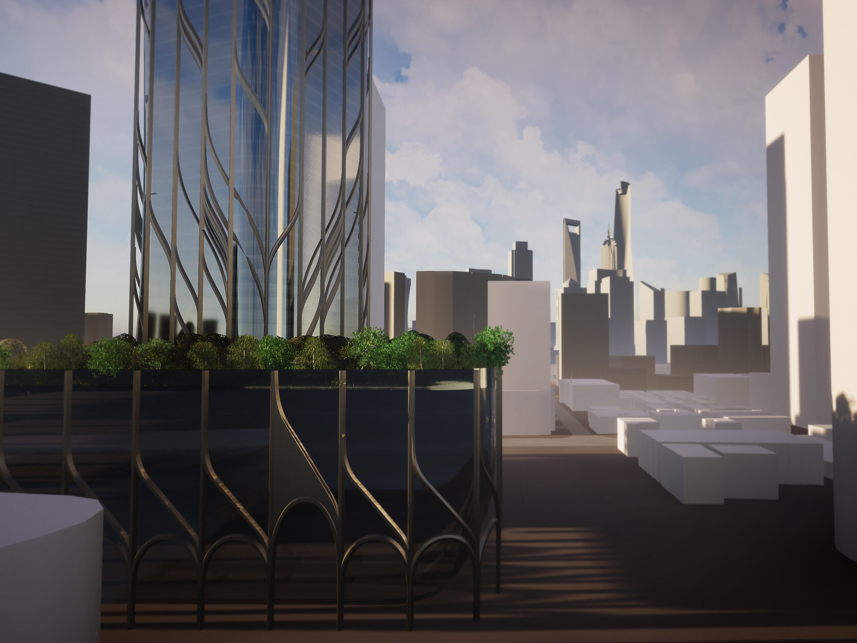 Lantern tower is inspired by traditional Chinese lanterns, with a metal frame structure on the facade, establishes a dialogue with the Jinmao Tower. The podium at the bottom of the tower is a retail mall, and the tower floors are mainly office areas. The facade of the podium at the bottom is inspired by Shikumen in Shanghai, which uses strong vertical lines and elegant wireframe of colonial style Shanghai ArtDeco.