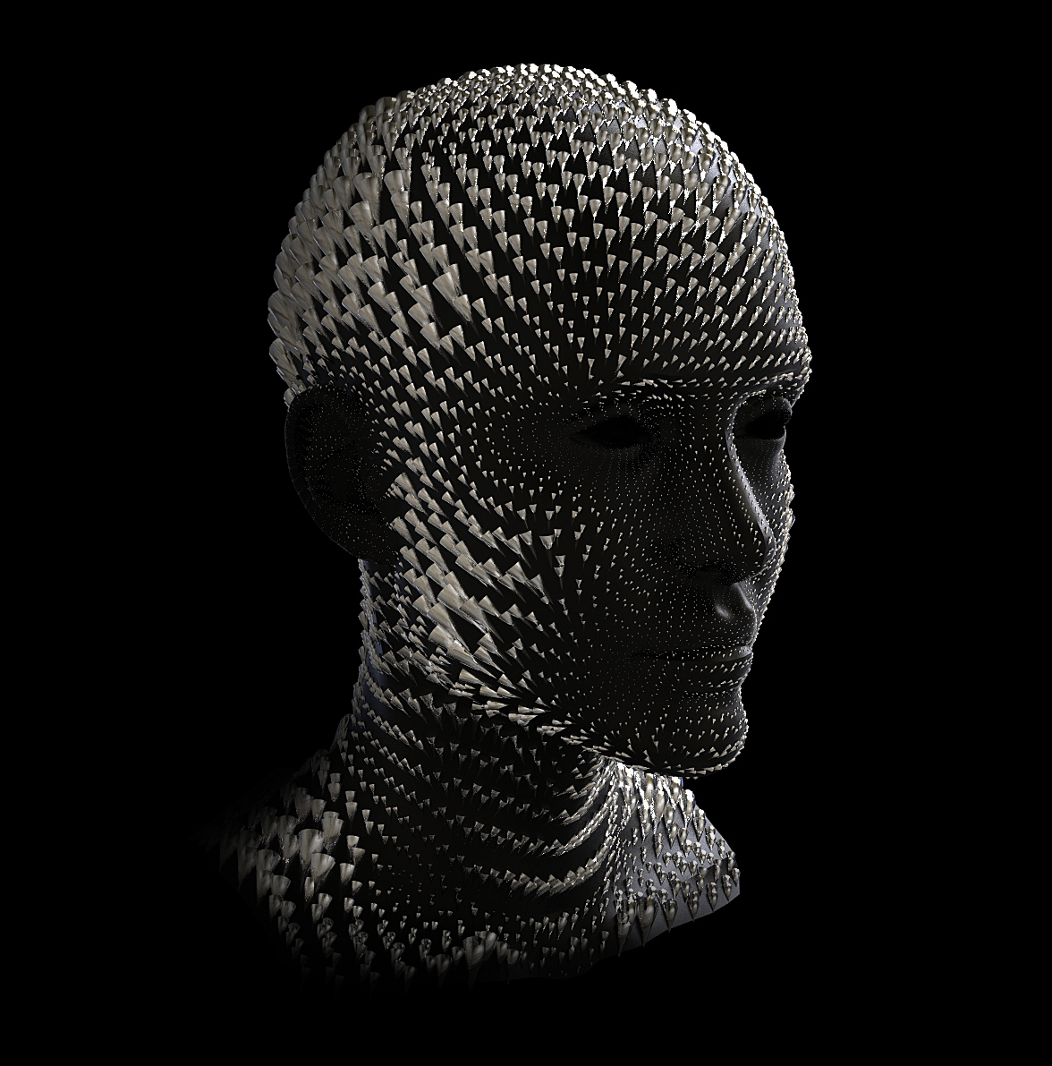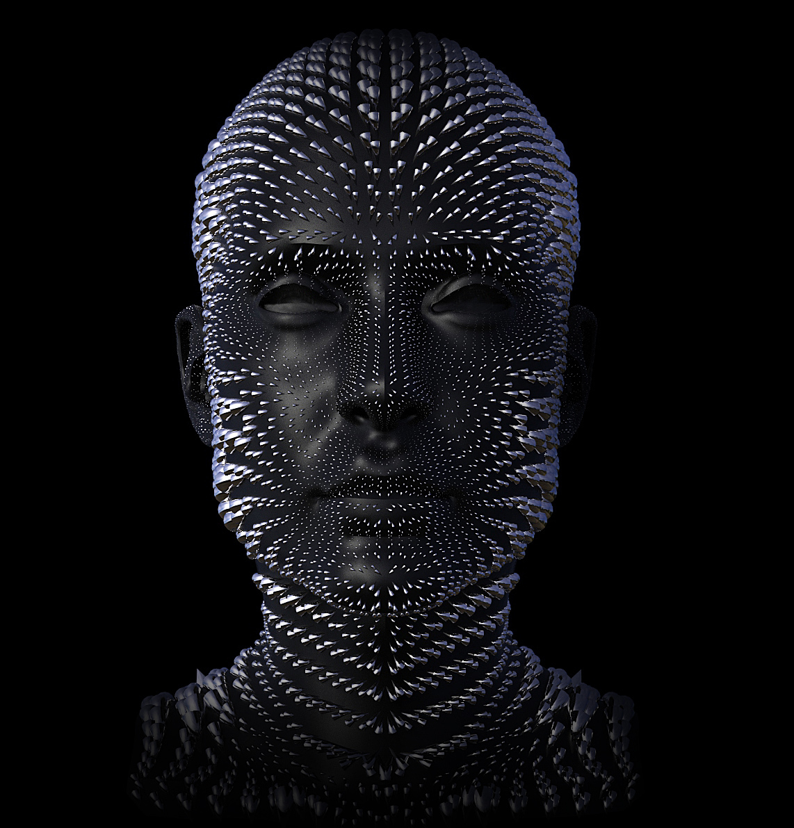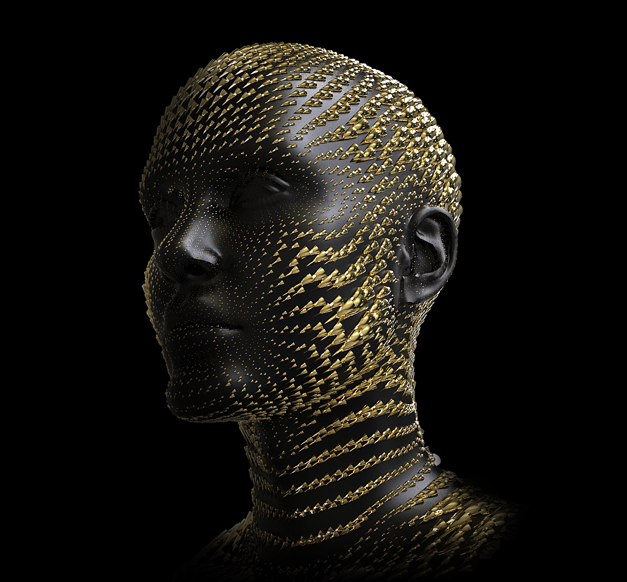 This 3D Make-up mask series have been created using computer digital techniques to generate a variable pattern that follows face features and topology of a given head characteristics, size, shape, surface curvature, etc. The same pattern of the 3D make-up will look differently on every face and head and emphasize a character of who is wearing the mask. Also, the material and colour of the make-up mask can be different. By varying colour and material different look and character can be achieved.