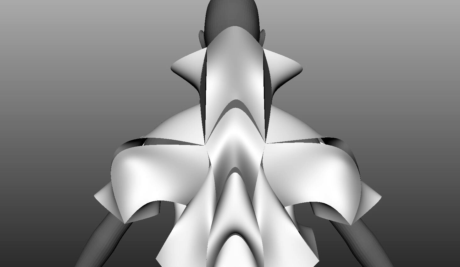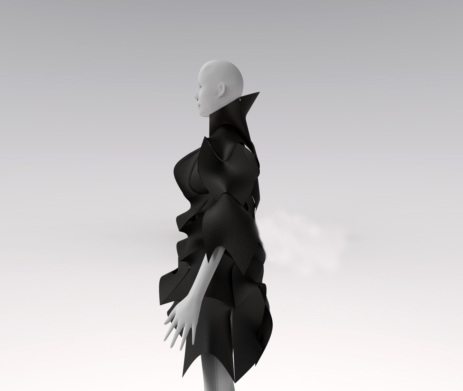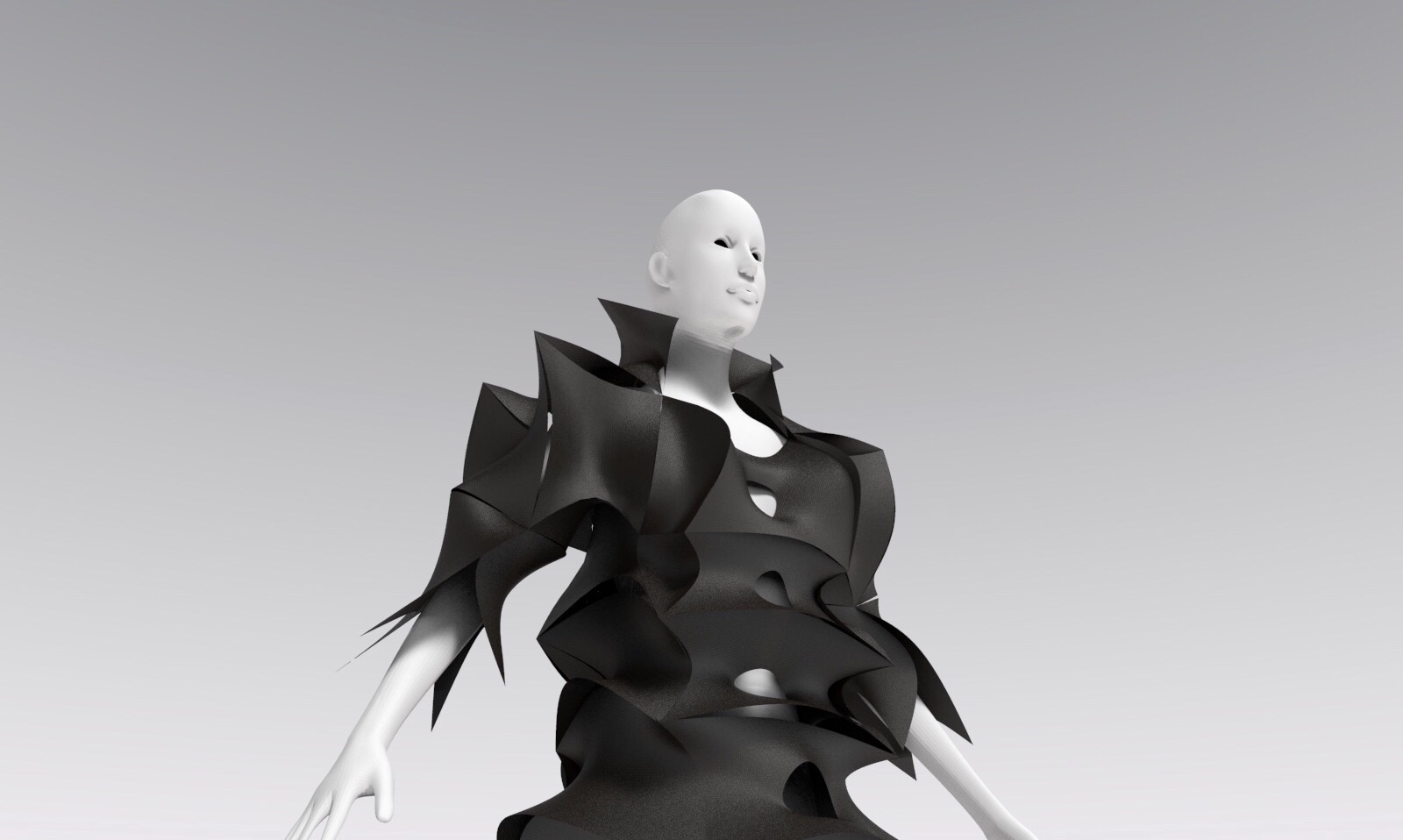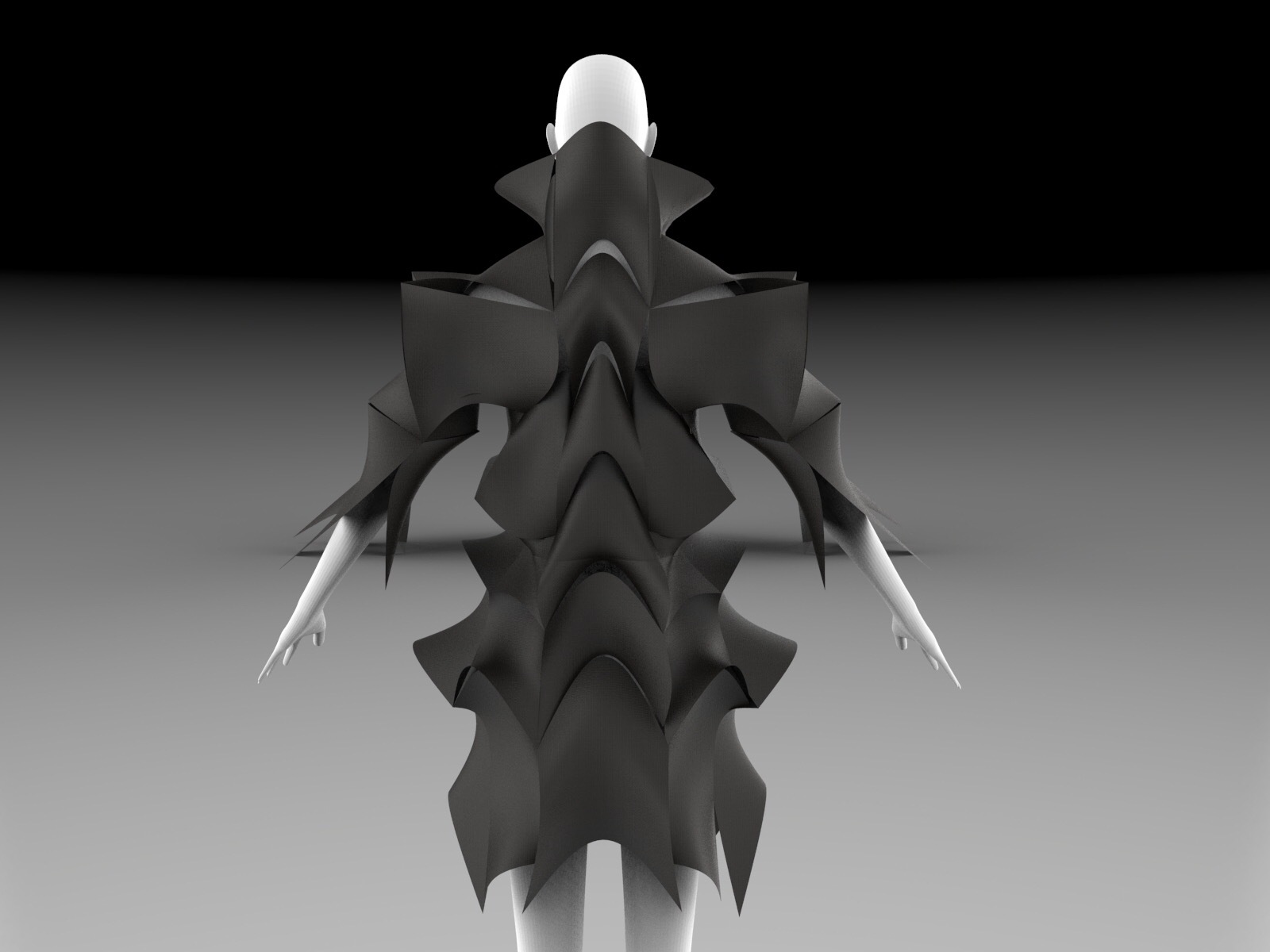 The design of this dress is based on the idea of architectural membranes and tensile structures applied in a woman’s garment. The project involves studies of hard edge boundary conditions and flexible membranes in-between made of stretched fabric. Also, the idea of a parametric component proliferated across the body adapting to its curves and varied surfaces makes the garment look coherent and integrated.