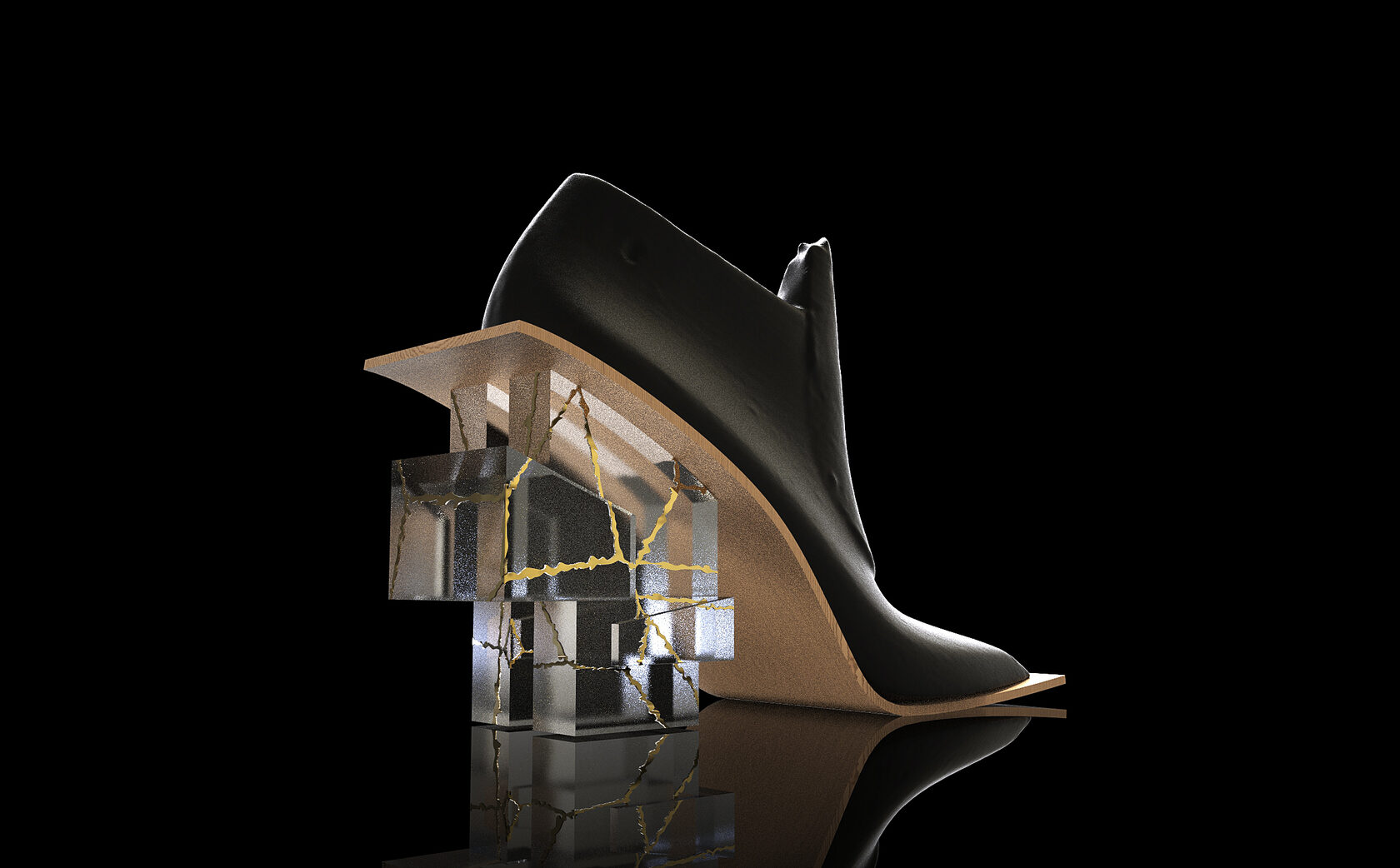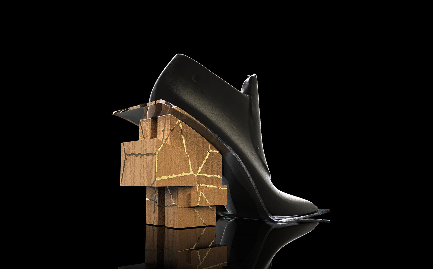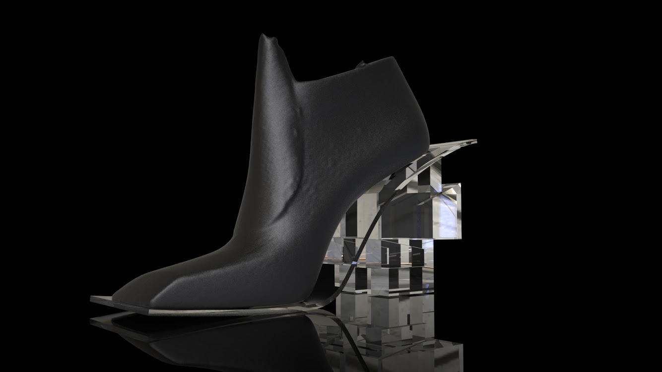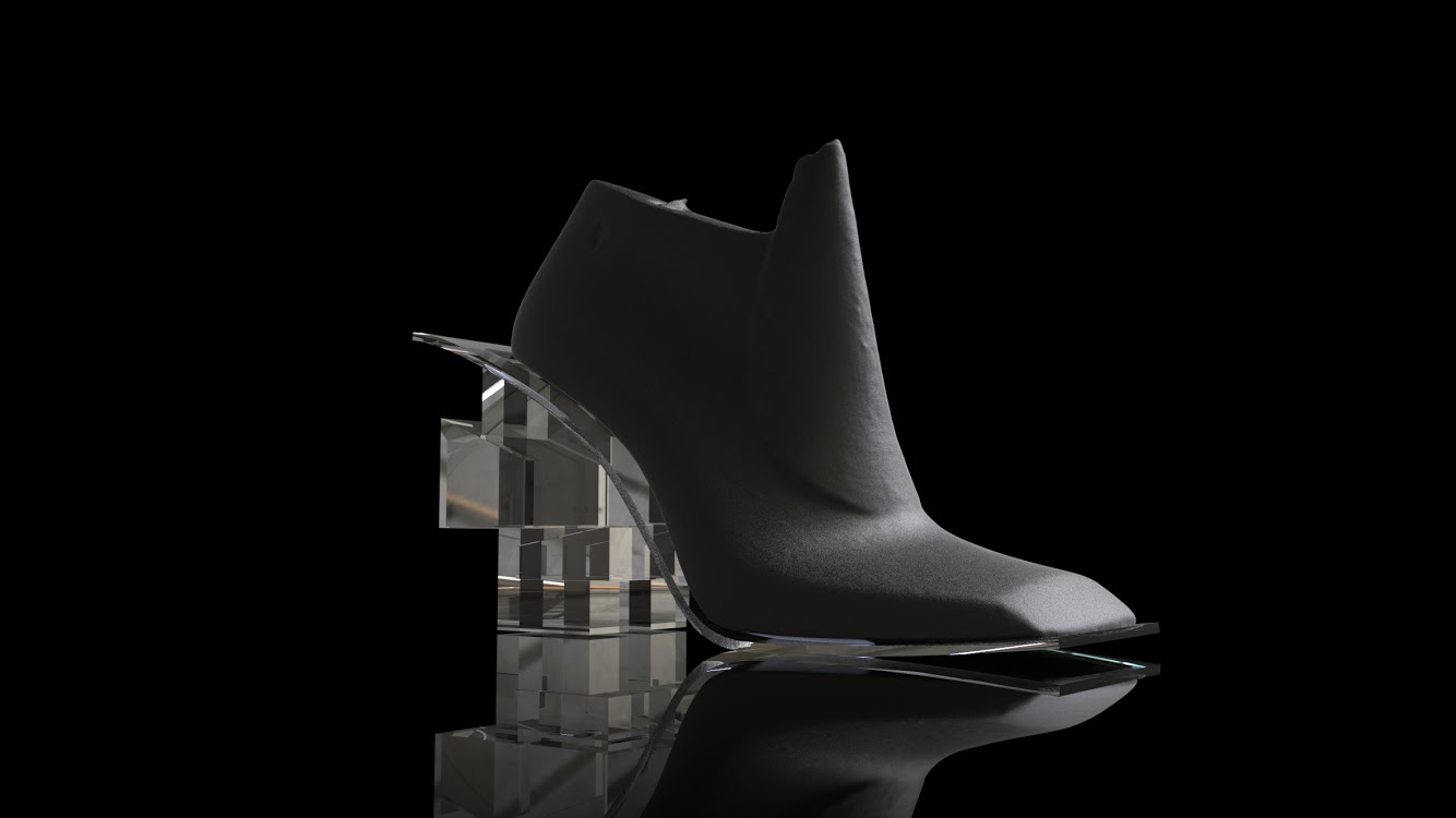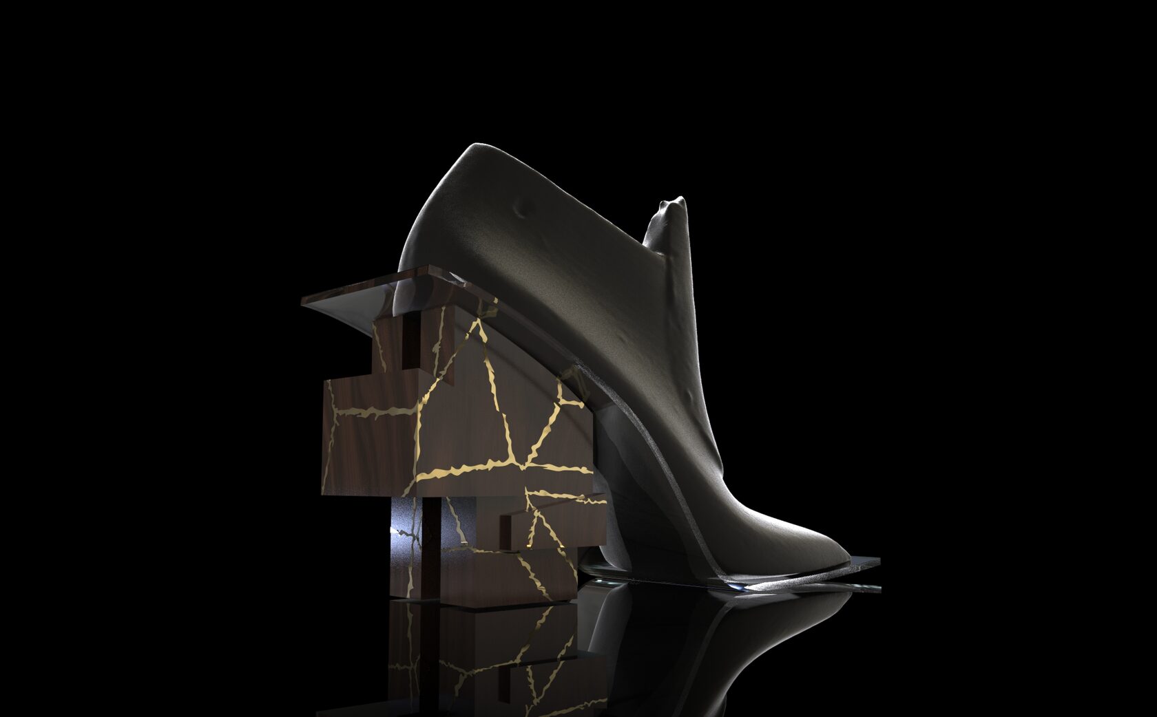 This design project is a collaboration with a shoe designer Yunfei Ma. She approached us to design a series of accessories namely iconic heels for her shoe design collection. We designed a number of unique signature heels that were inspired by architecture references of brutalist movement. Another concept and inspiration for us was Kintsugi – the ancient Japanese technique of pottery repairing with melted gold. Both these concepts were forming our design language for the accessories. We also experimented with digital algorithms that simulate cracking of solid objects to recreate the Kintsugi effect digitally in 3D software.