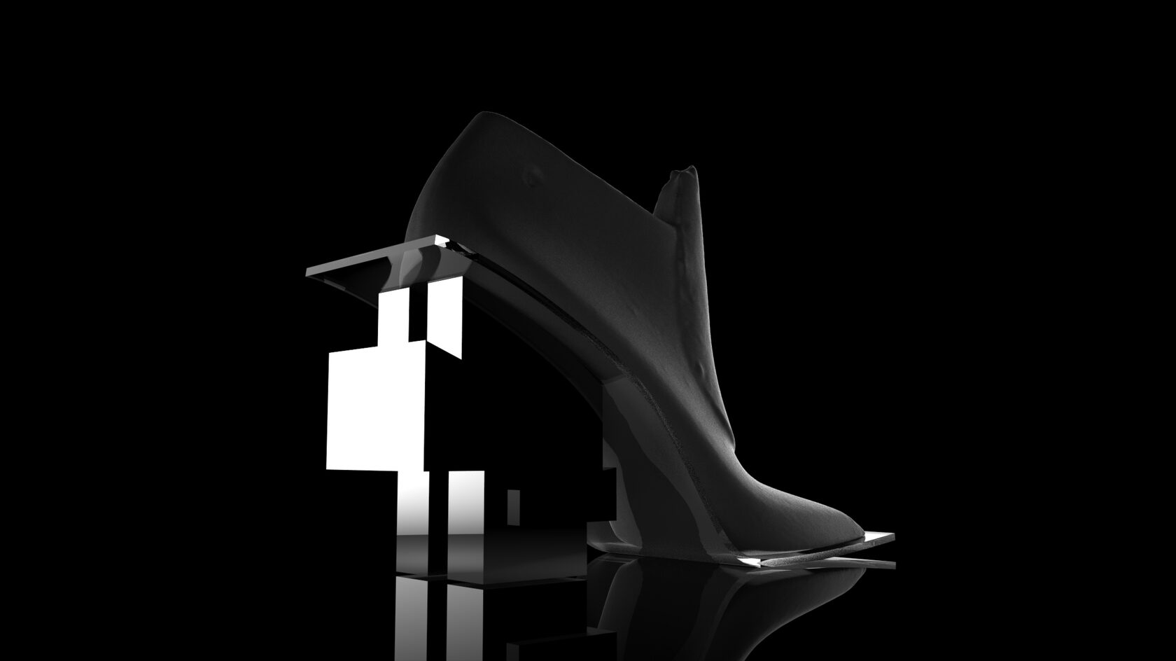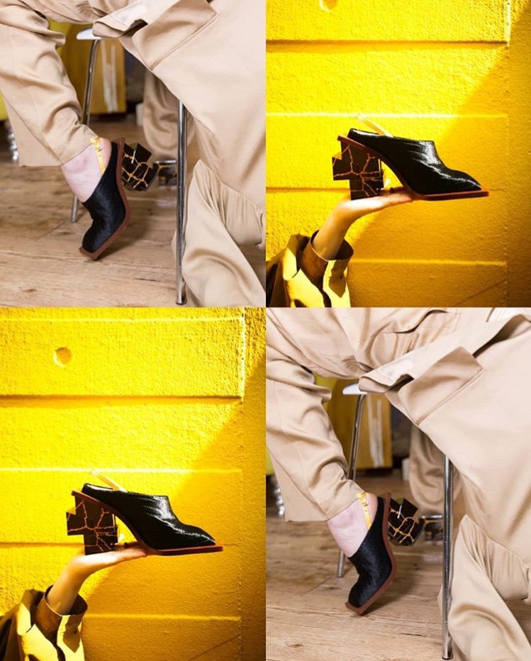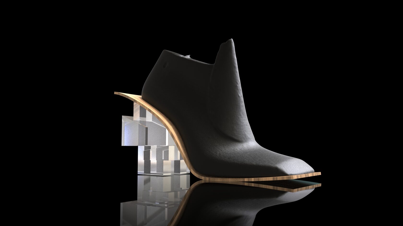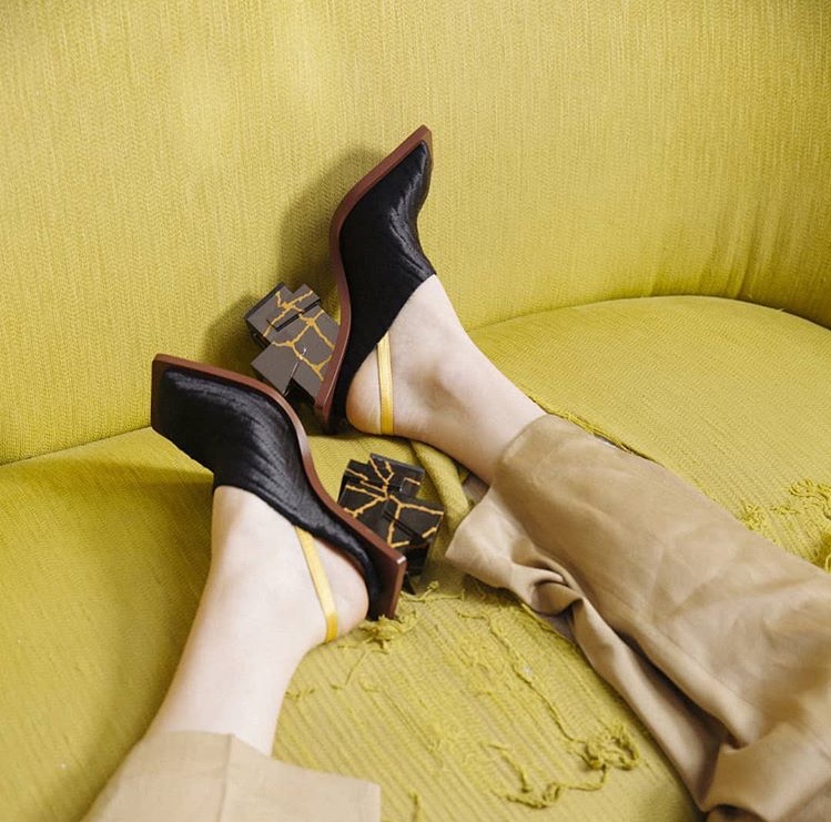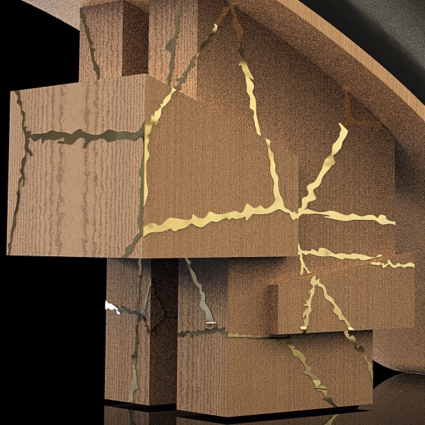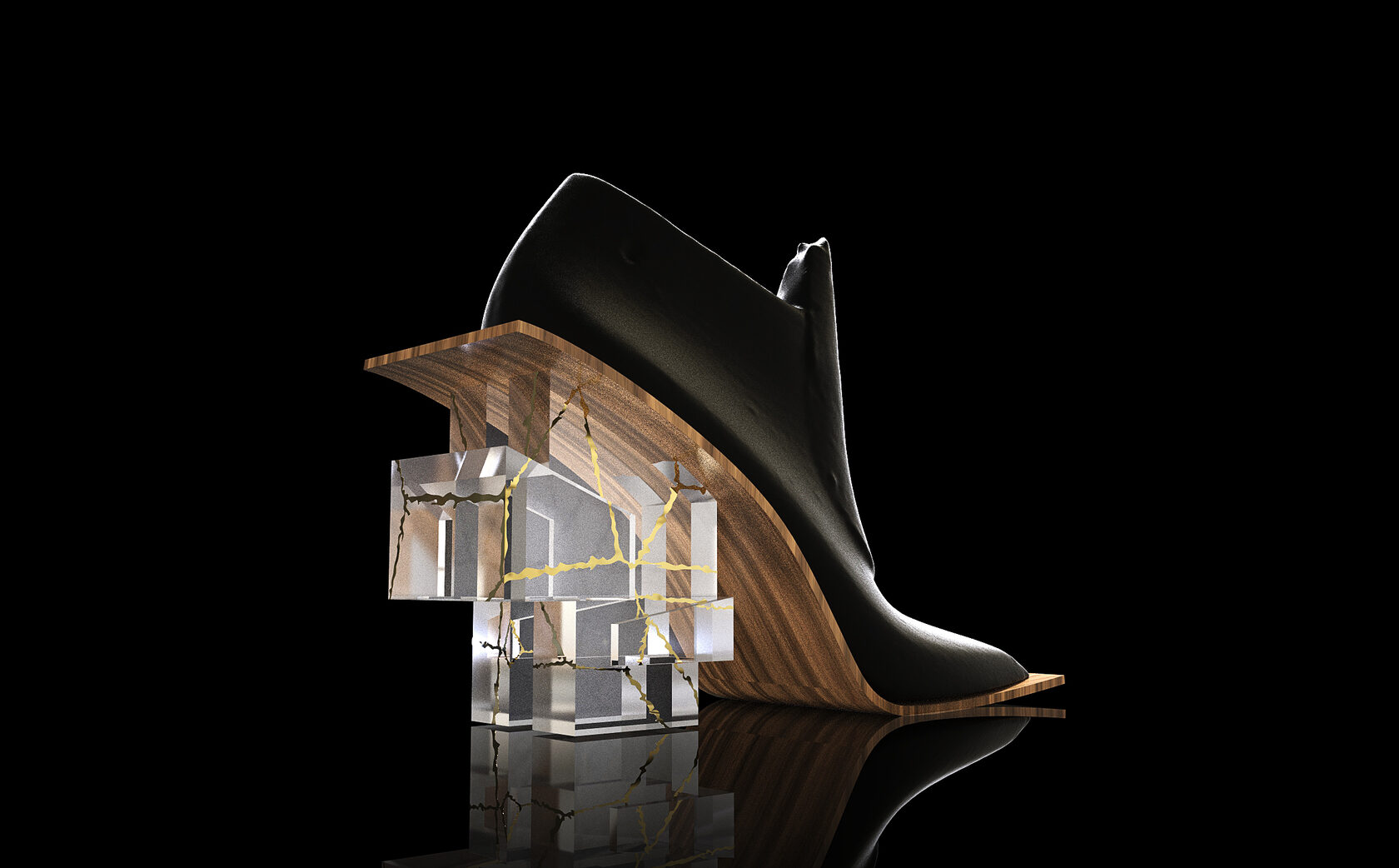 This design project is a collaboration with a shoe designer Yunfei Ma. She approached us to design a series of accessories namely iconic heels for her shoe design collection. We designed a number of unique signature heels that were inspired by architecture references of brutalist movement. Another concept and inspiration for us was Kintsugi – the ancient Japanese technique of pottery repairing with melted gold. Both these concepts were forming our design language for the accessories. We also experimented with digital algorithms that simulate cracking of solid objects to recreate the Kintsugi effect digitally in 3D software.