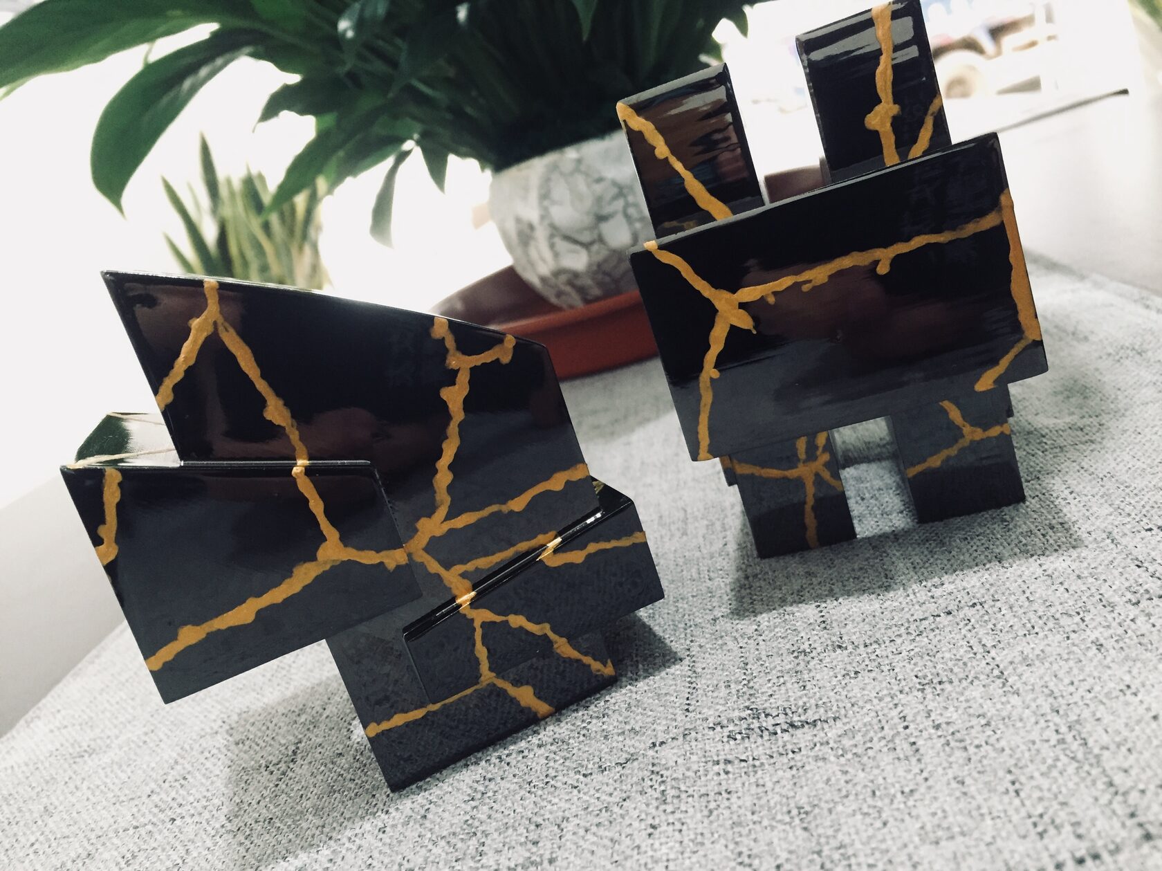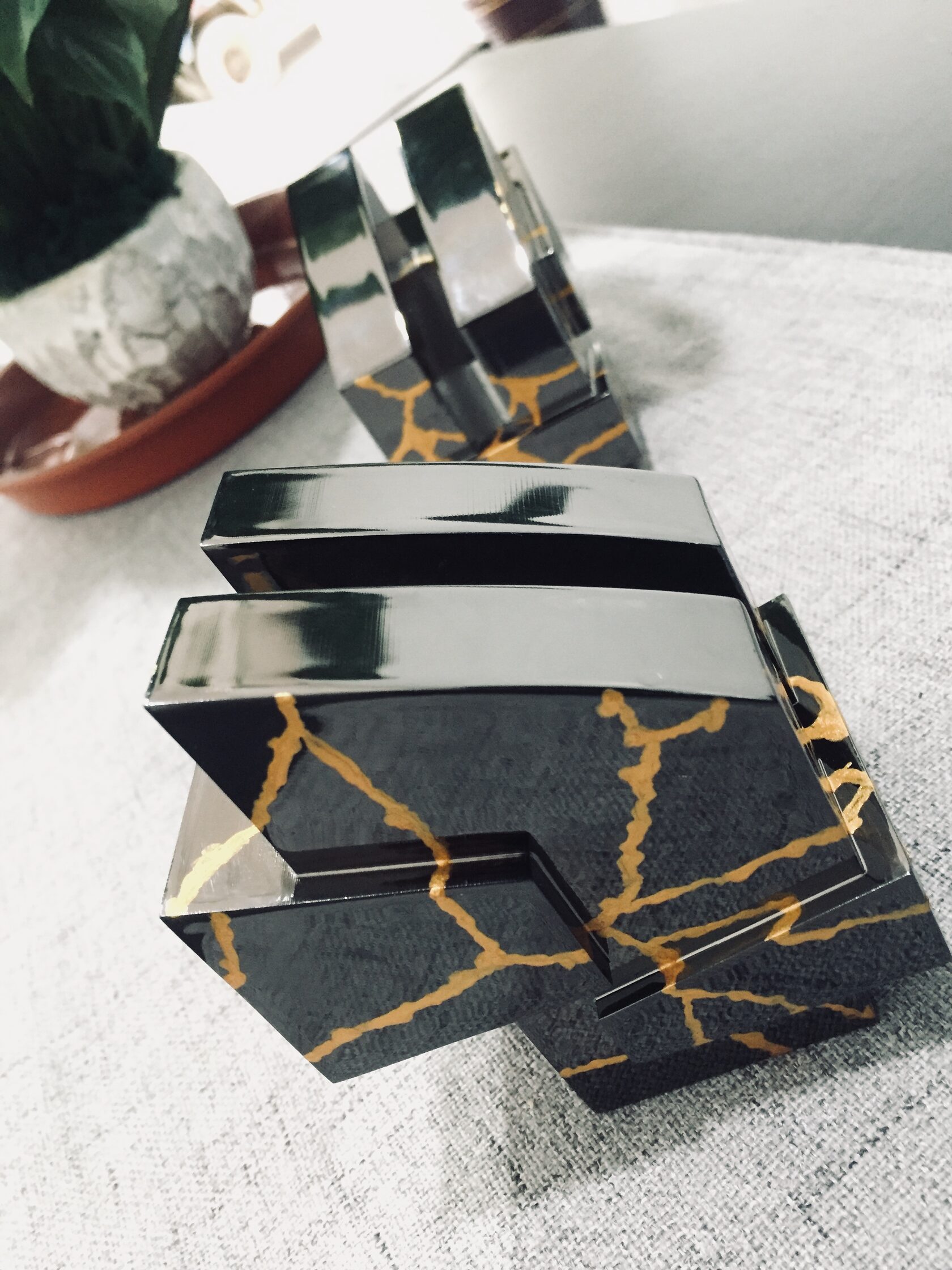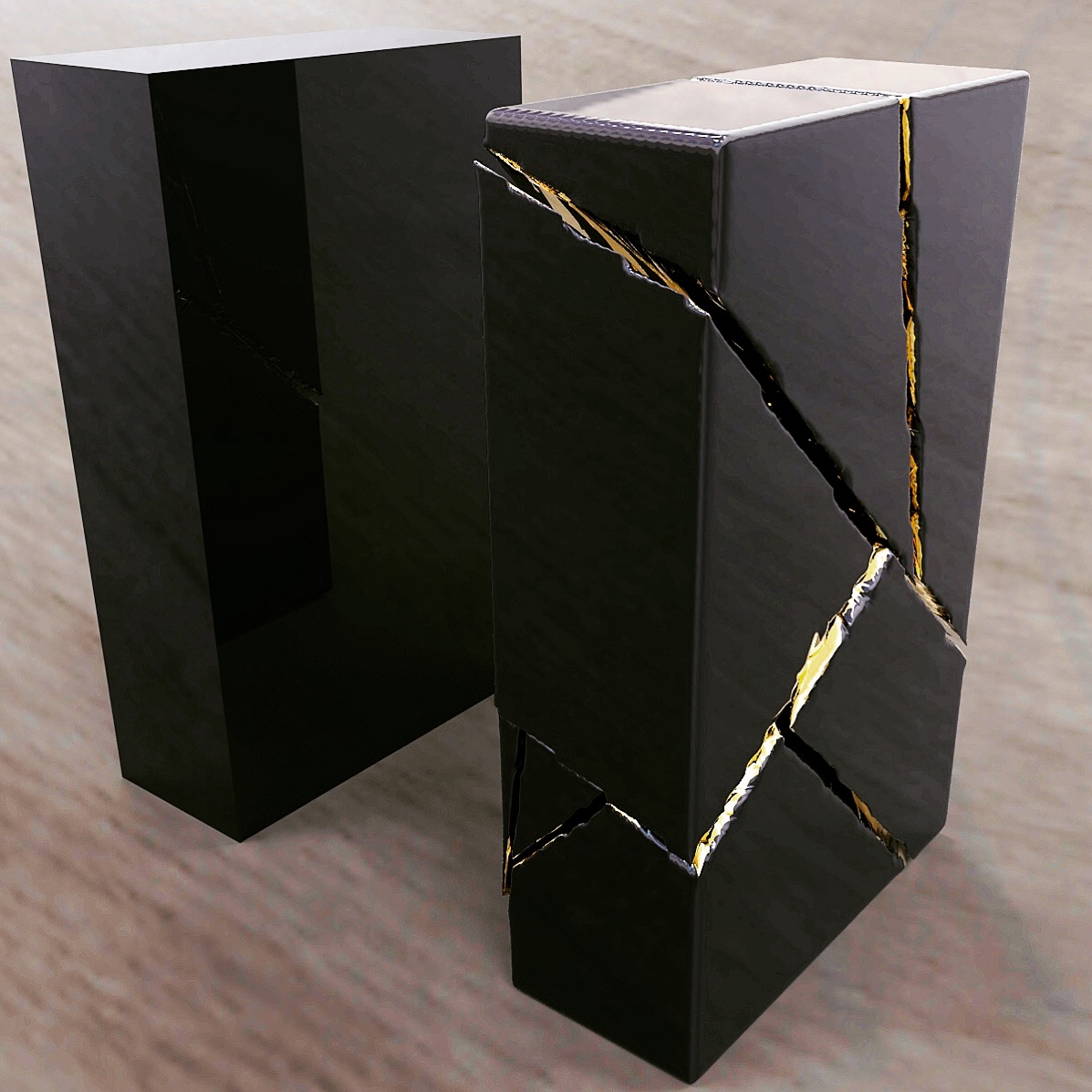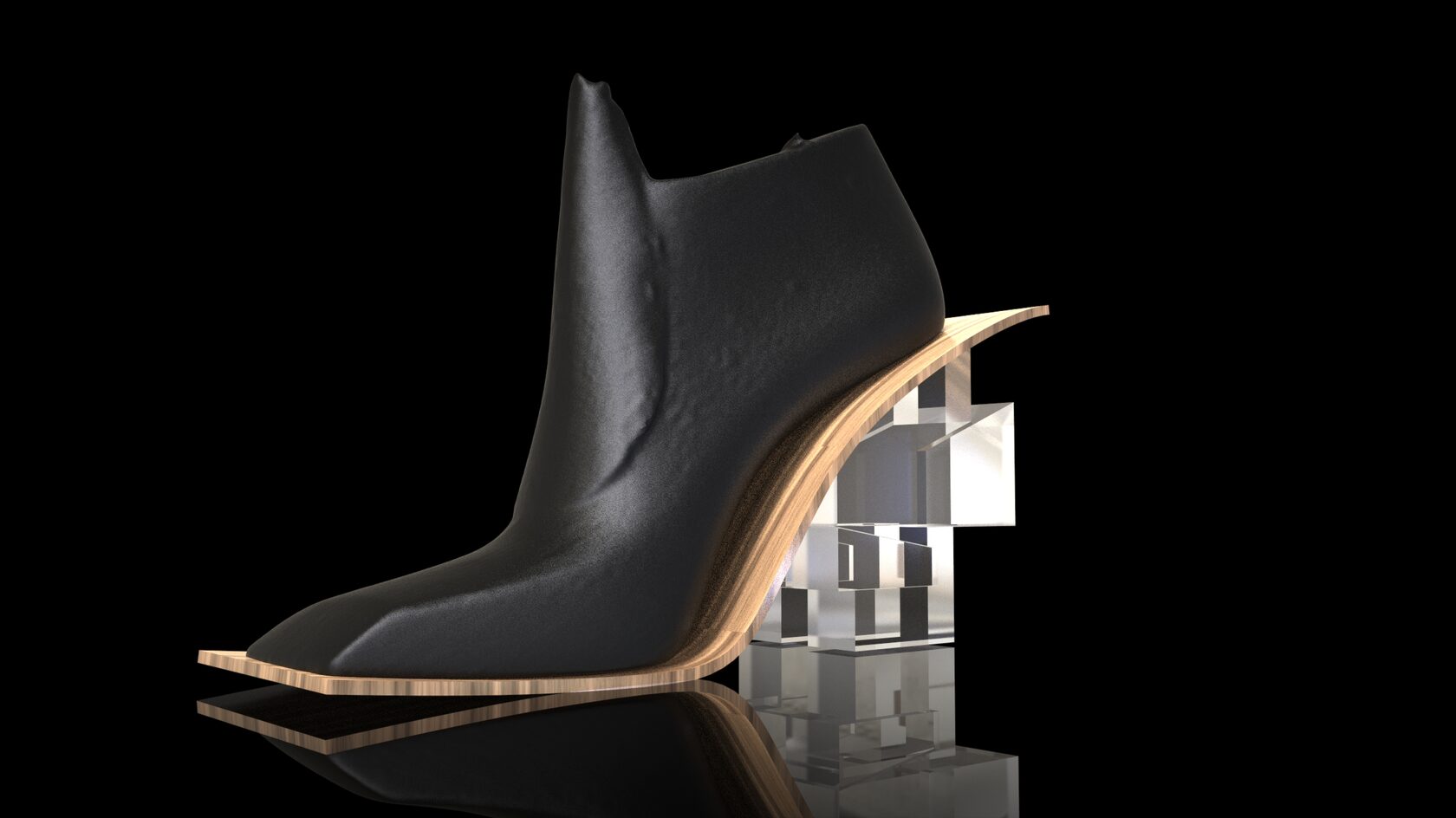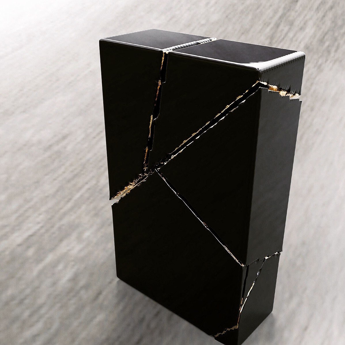 This design project is a collaboration with a shoe designer Yunfei Ma. She approached us to design a series of accessories namely iconic heels for her shoe design collection. We designed a number of unique signature heels that were inspired by architecture references of brutalist movement. Another concept and inspiration for us was Kintsugi – the ancient Japanese technique of pottery repairing with melted gold. Both these concepts were forming our design language for the accessories. We also experimented with digital algorithms that simulate cracking of solid objects to recreate the Kintsugi effect digitally in 3D software.