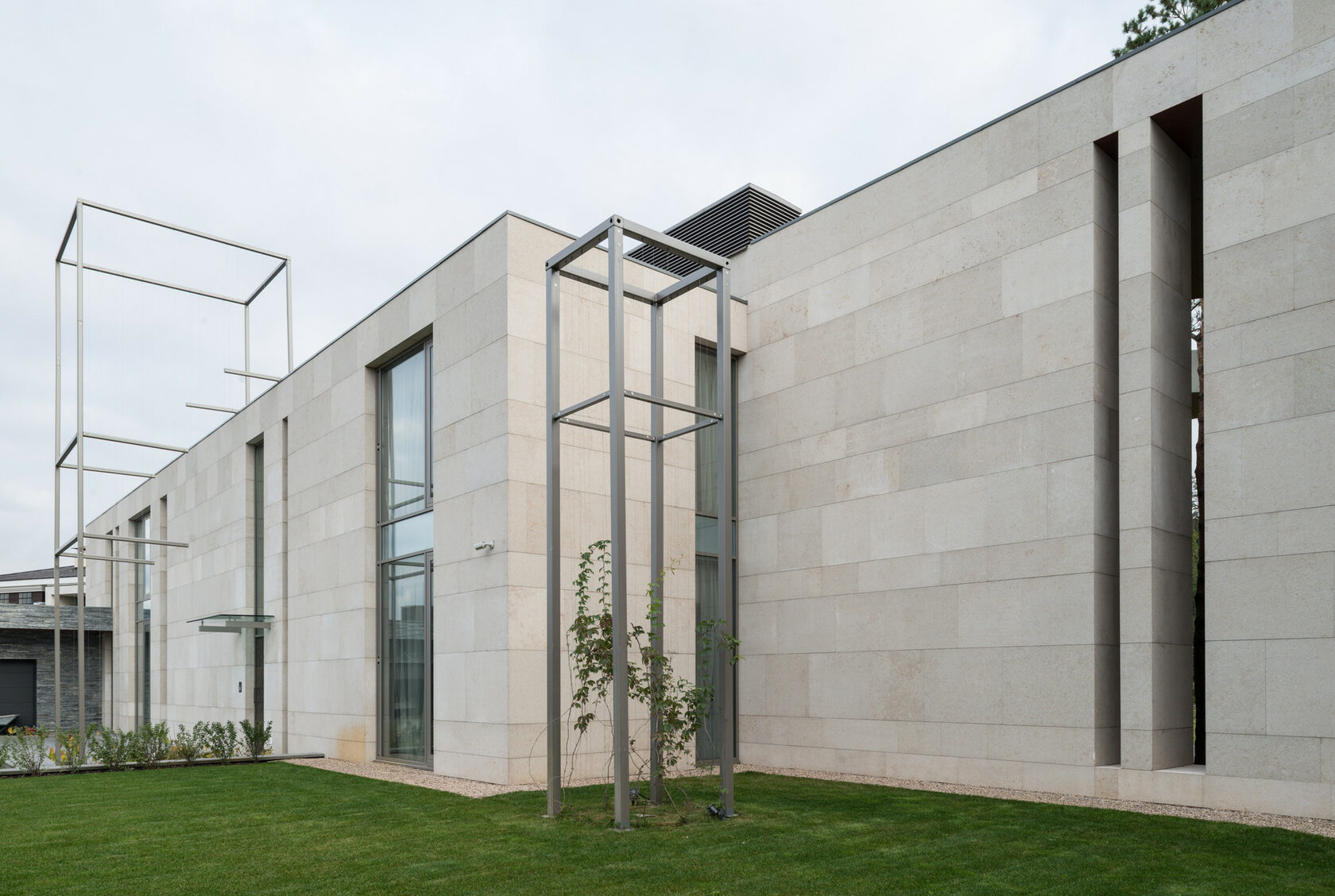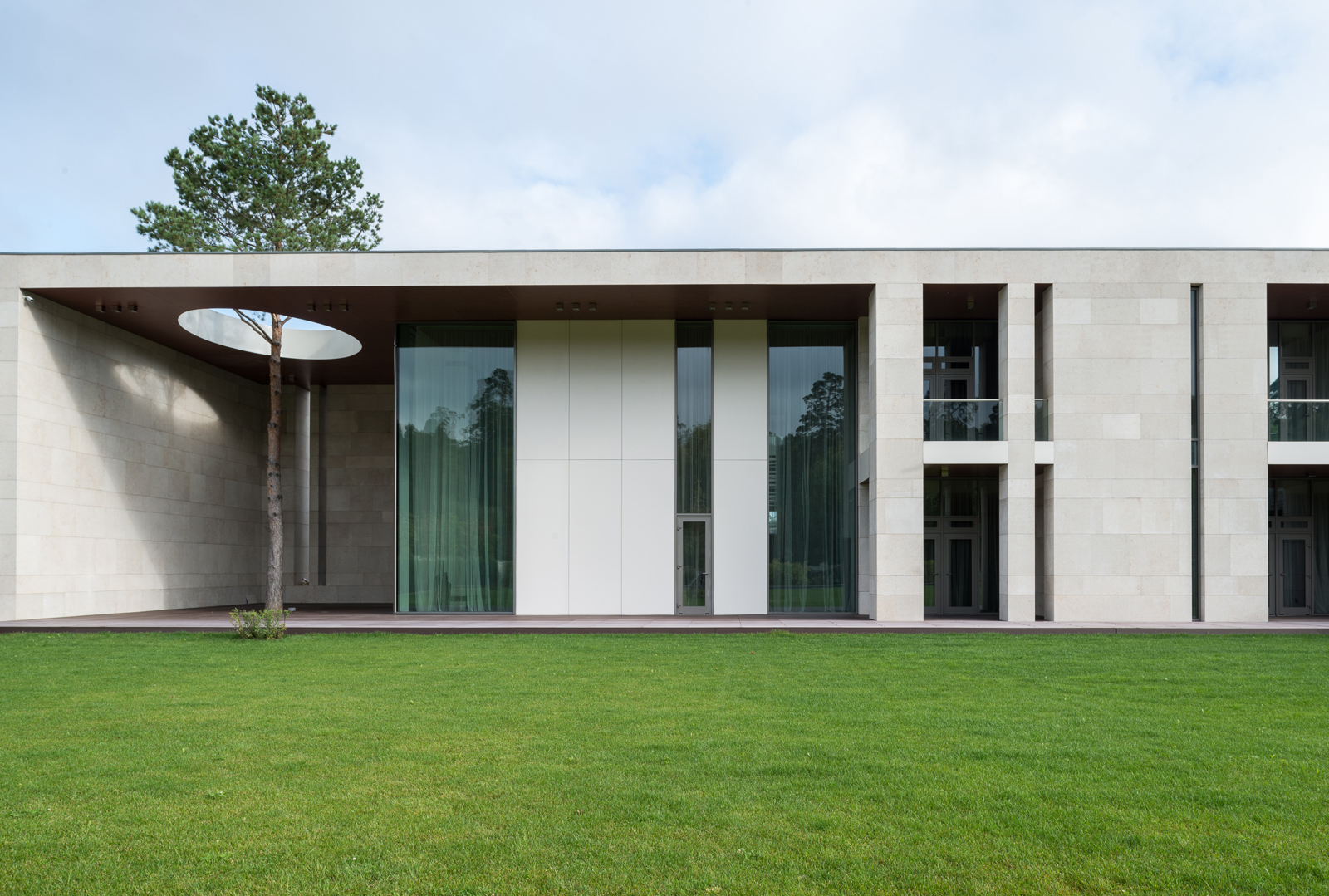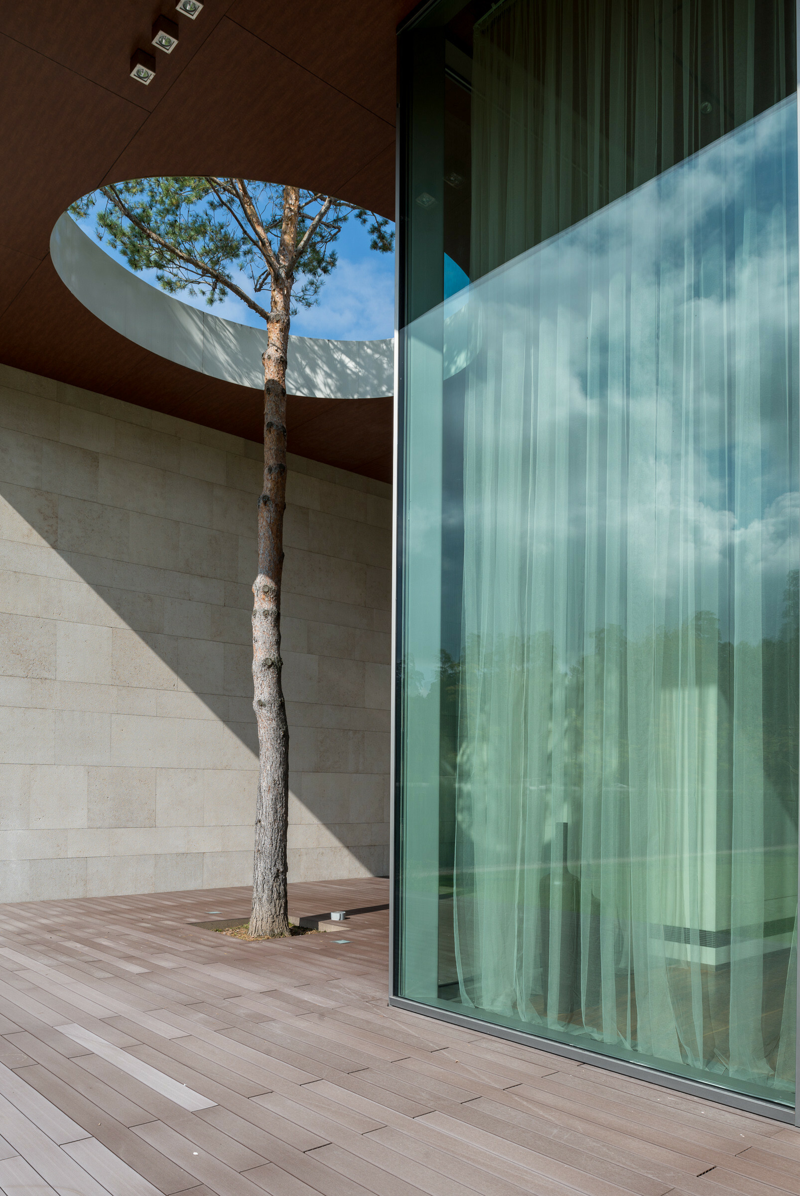 The rooms that are more private face the entrance. Panoramic windows of the living room, dining room and bedroom are facing the courtyard. The main open veranda of the house is located on the same side.