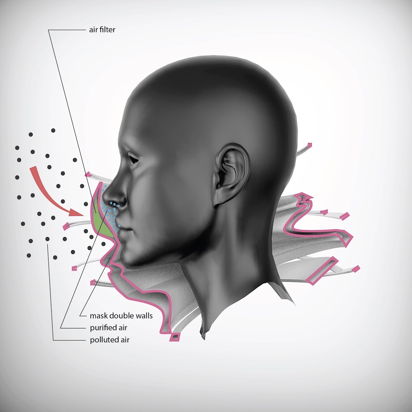 The mask is designed for people who live in highly polluted cities such as, Beijing, Tokyo, Seoul, Moscow, and other big metropolises where the air and smog is a big problem. People have to wear air filtering masks to protect themselves from the polluted environment. Normally those are medical masks of different kinds. However, the idea of this mask is to turn this piece into a fashion feature like a jewellery design that a person can use not only as a tool to purify air but also as a fashion accessory.