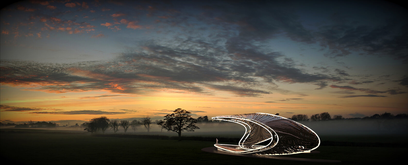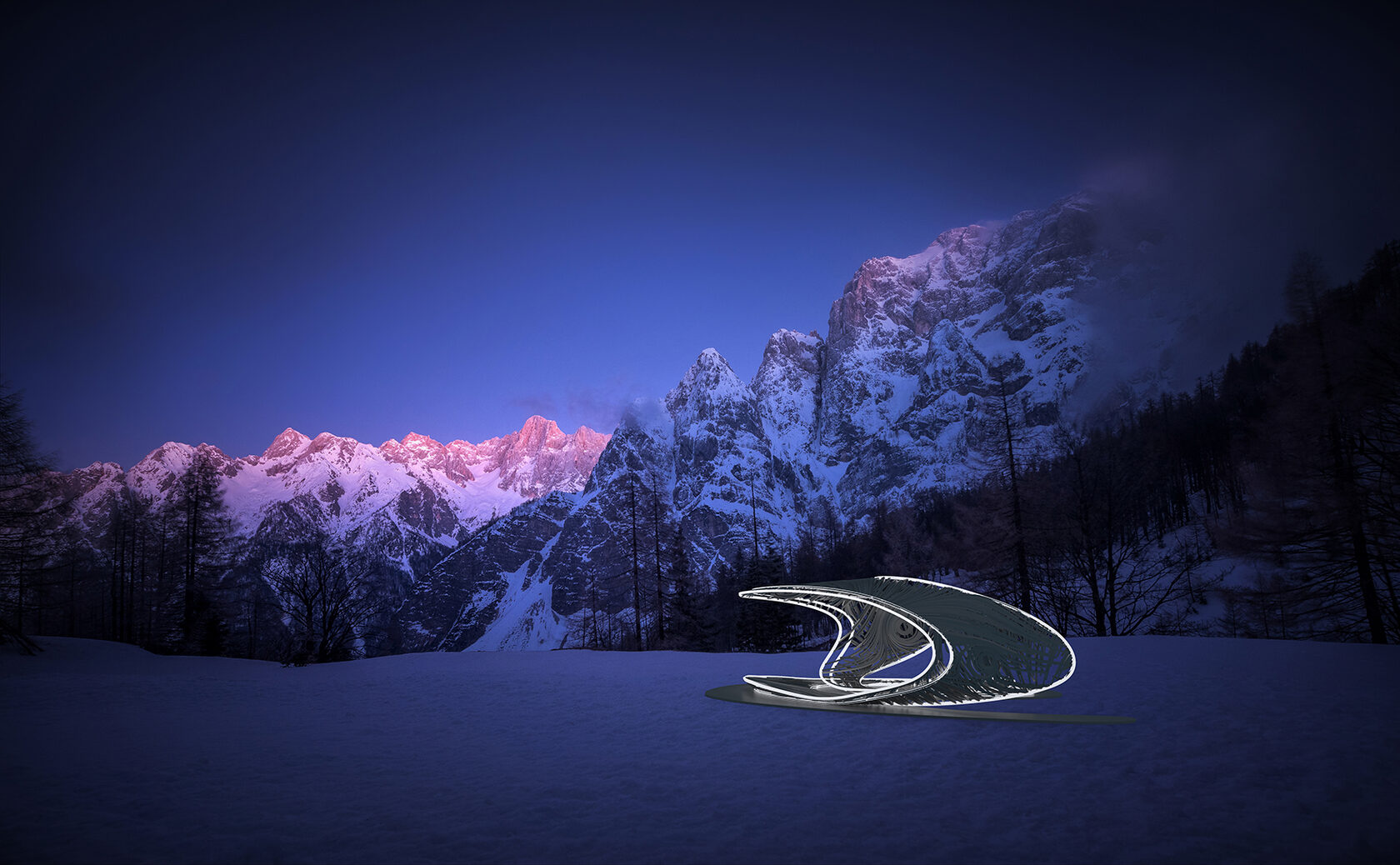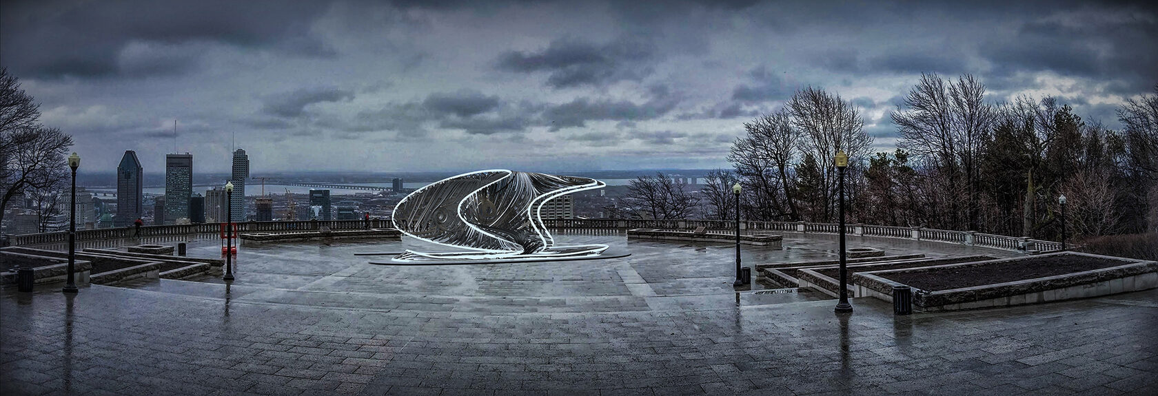 The art installation standing on the platform which is made of stone. The structure made of aluminum profiles that can be infinitely recycled , which makes the design sustainable. The LED lighting of the installation made in such a way that it expresses the elegant silhouette of the structure following the edge loops of the form.