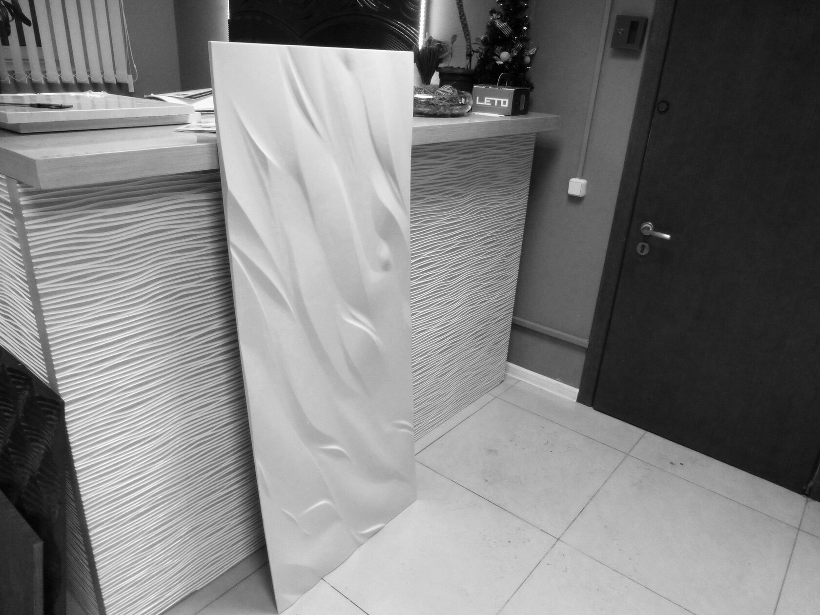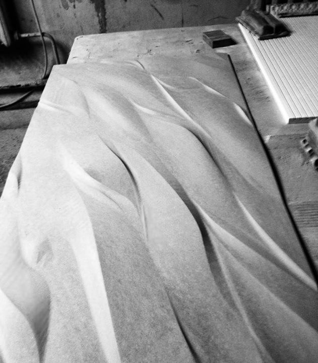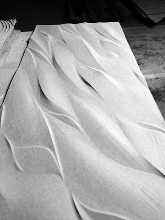 The design of the 3D wall panels was inspired by sea wave pattern. One panel consists of 4 subpanels that are symmetrical in X and Y direction. The panels are milled using CNC-machine with the relief depth of 18 mm.