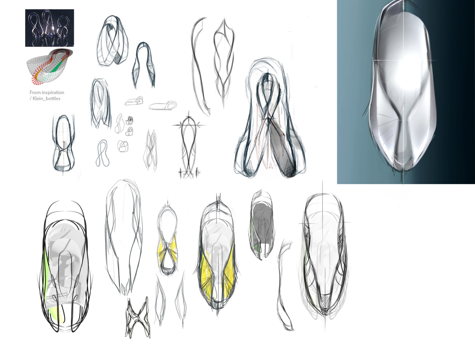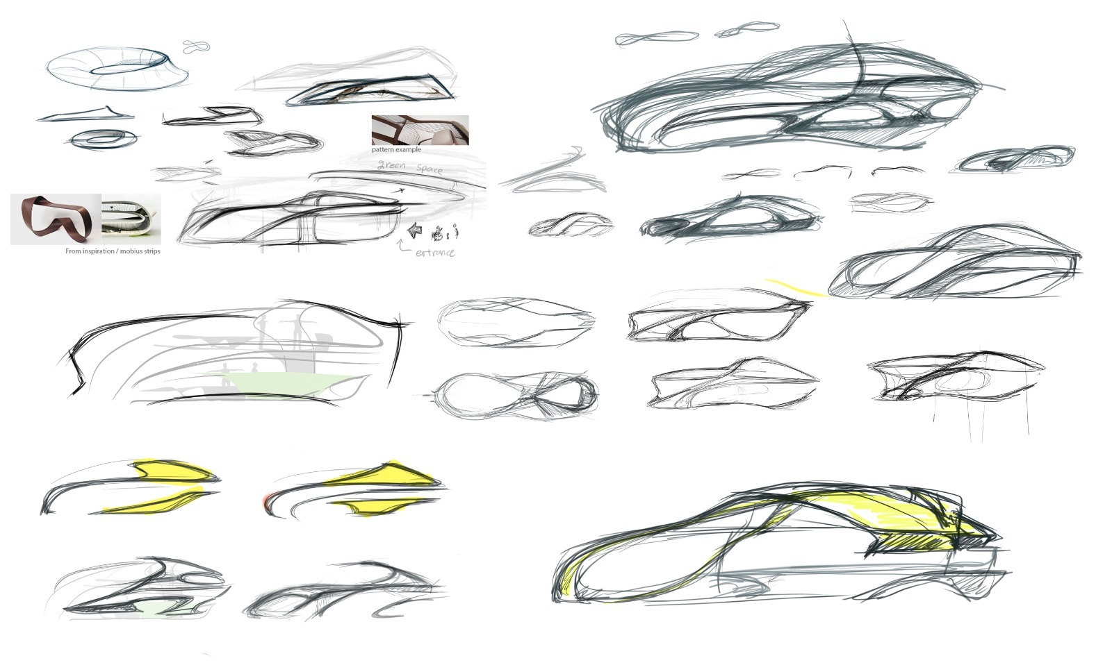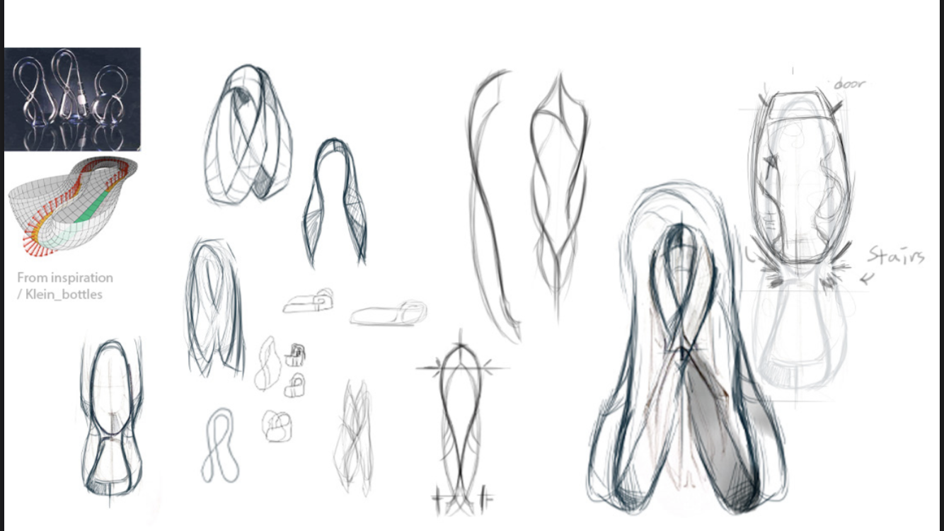 The formal design language is inspired by a Mobius loop and Klein Bottle found by mathematicians. The outer shell of vehicle is merging with interior and some surfaces twist from outside inwards forming uninterrupted flow of curves and surfaces.