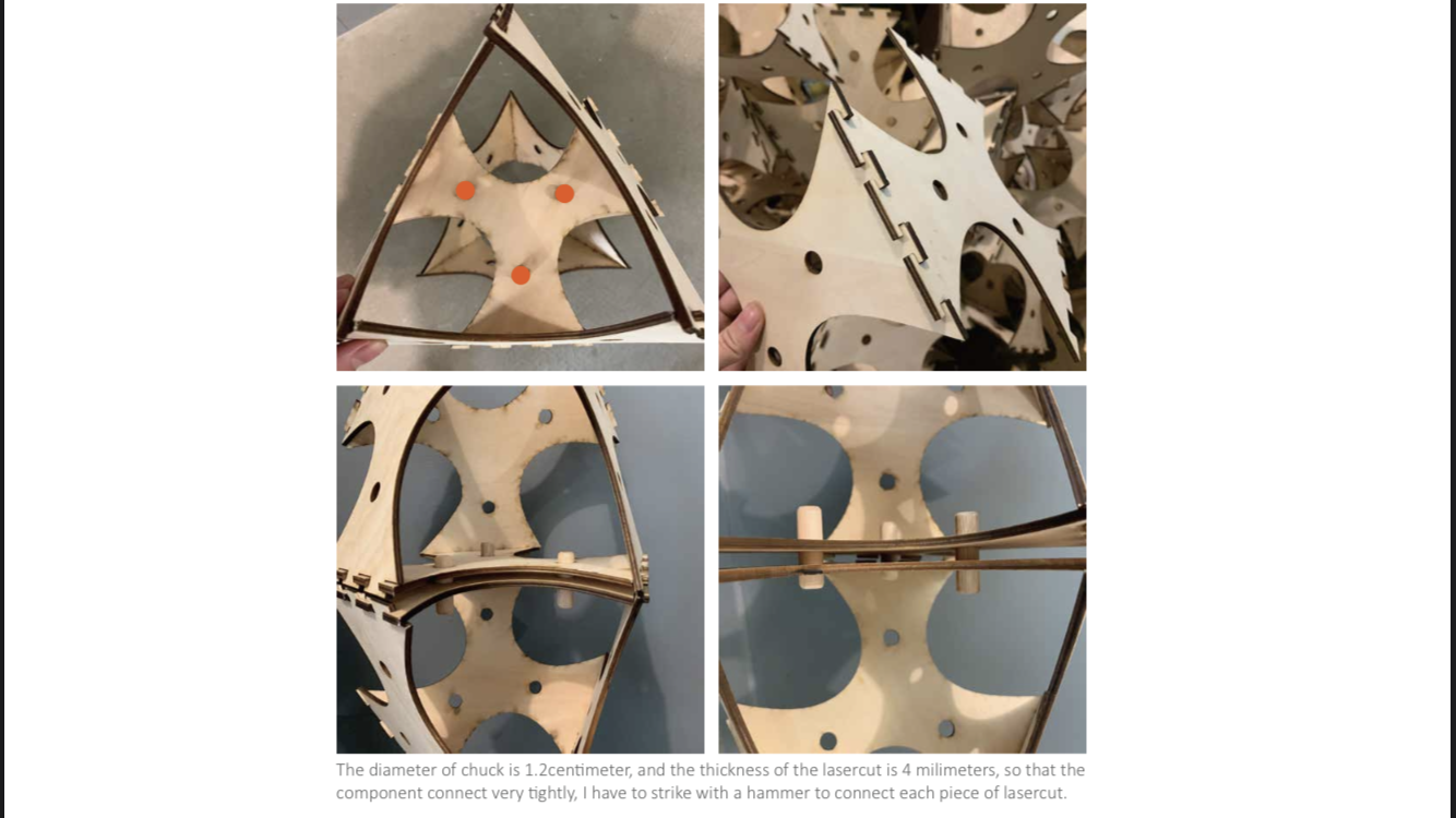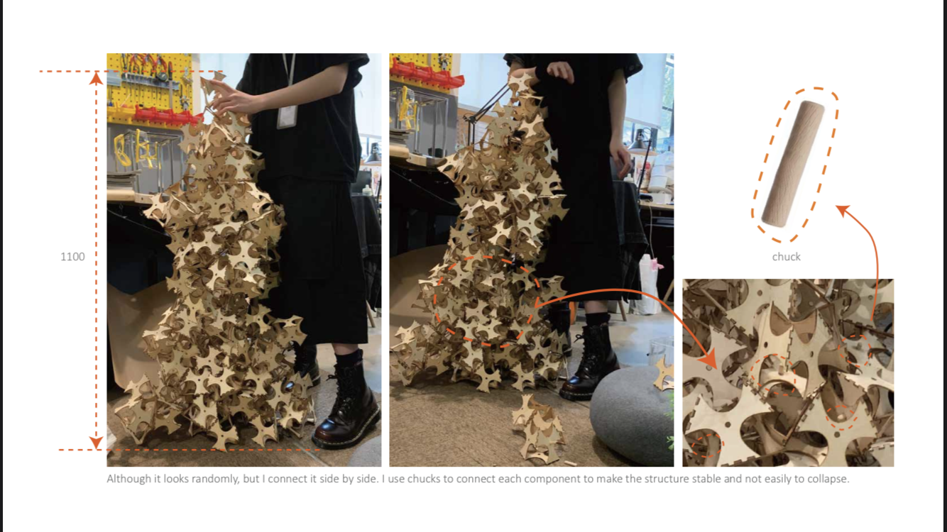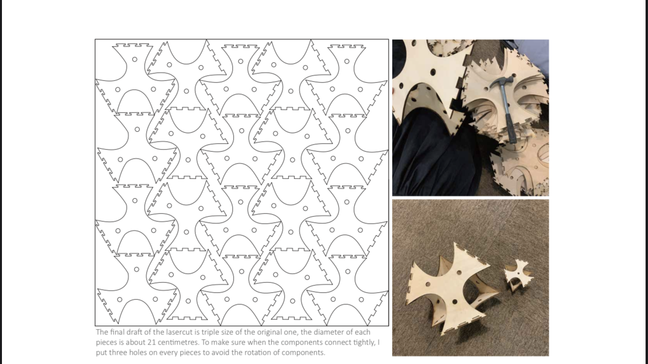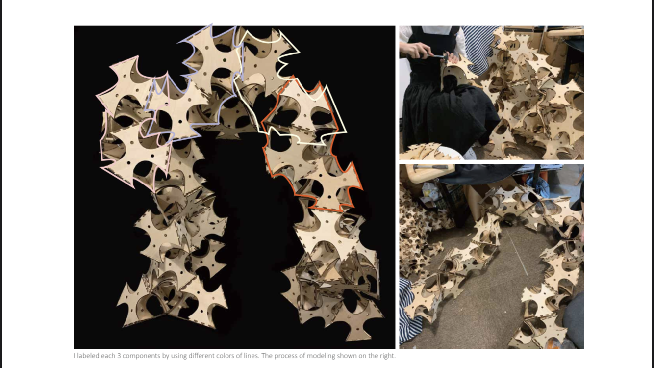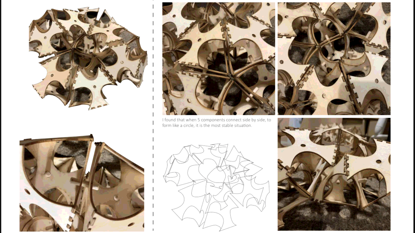 The installation had to be maximum adaptable to any space conditions and create a space filling structure that had to be easily assembled and disassembled. Using laser-cutting machine numerous identical components were produced by the student and assembled manually achieving various spatial configurations.