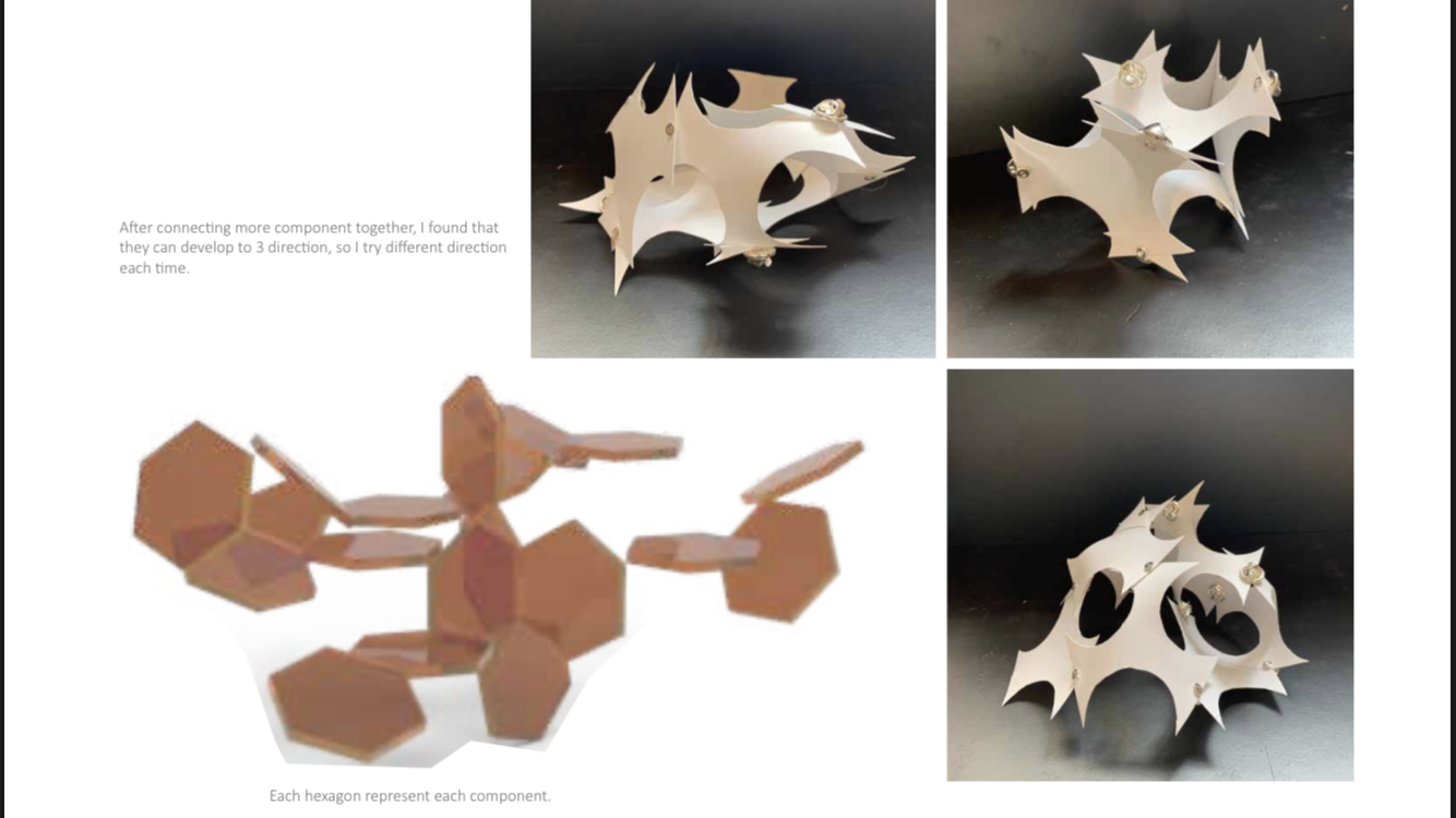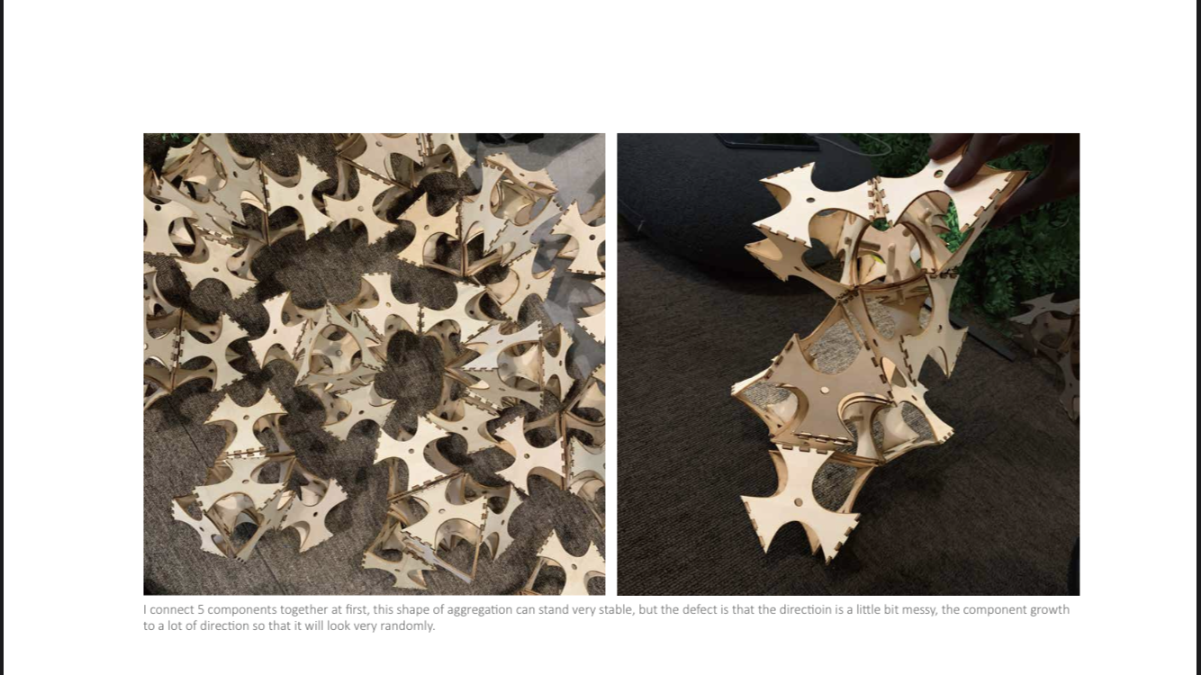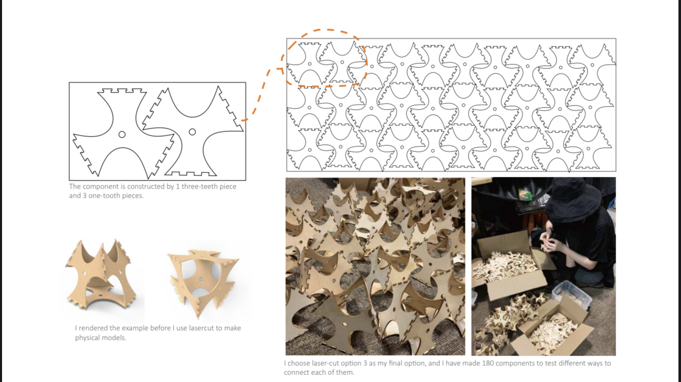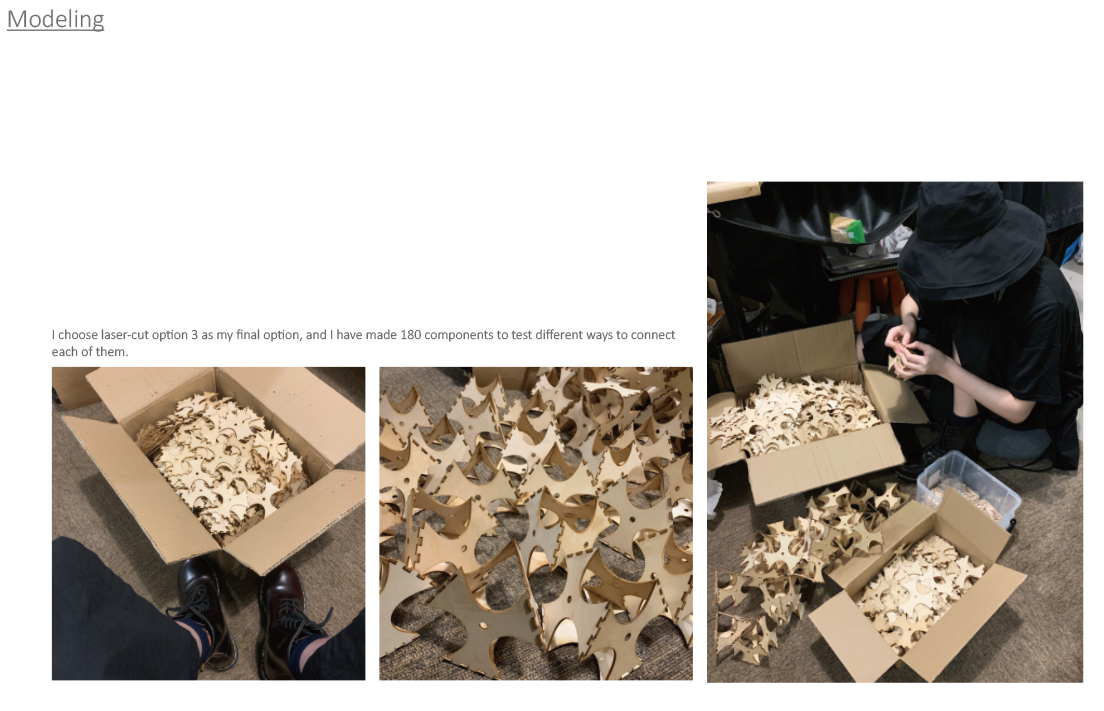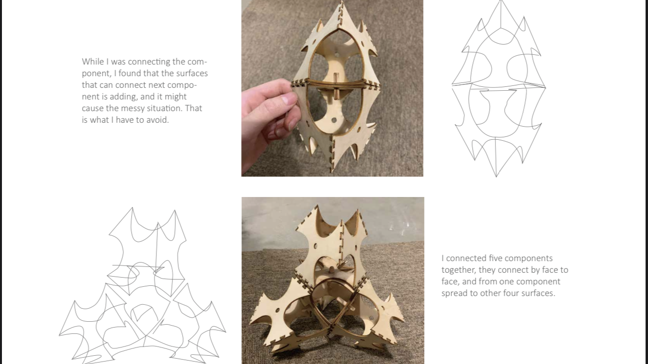 The installation had to be maximum adaptable to any space conditions and create a space filling structure that had to be easily assembled and disassembled. Using laser-cutting machine numerous identical components were produced by the student and assembled manually achieving various spatial configurations.