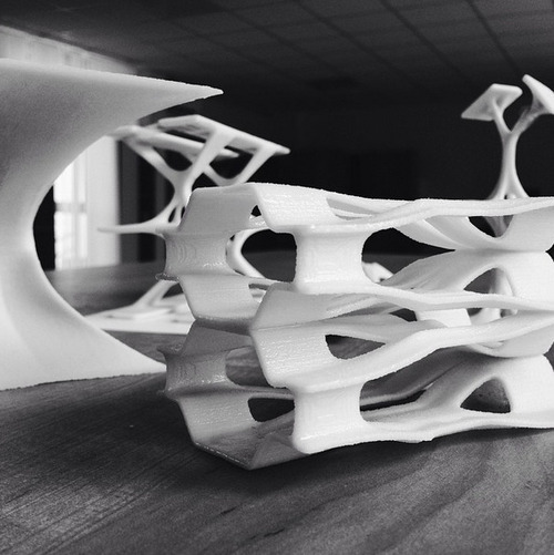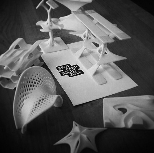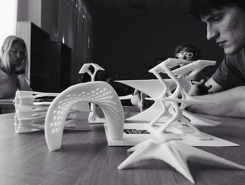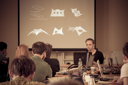 The students were taught how to use algorithmic and modelling tools, as well as real-time simulation (Grasshopper, Millipede, Autodesk Maya) to create an architectural installation informed by its structural forces such as stress, strain, and deflection. Each team had to design one of the four given structural elements - a column, a slab, a node, and a shell roof by observing the flow of forces within tested design options. Parallel to the digital testing of design options, 3D printers were used by the students to test their idea on small scale physical models.